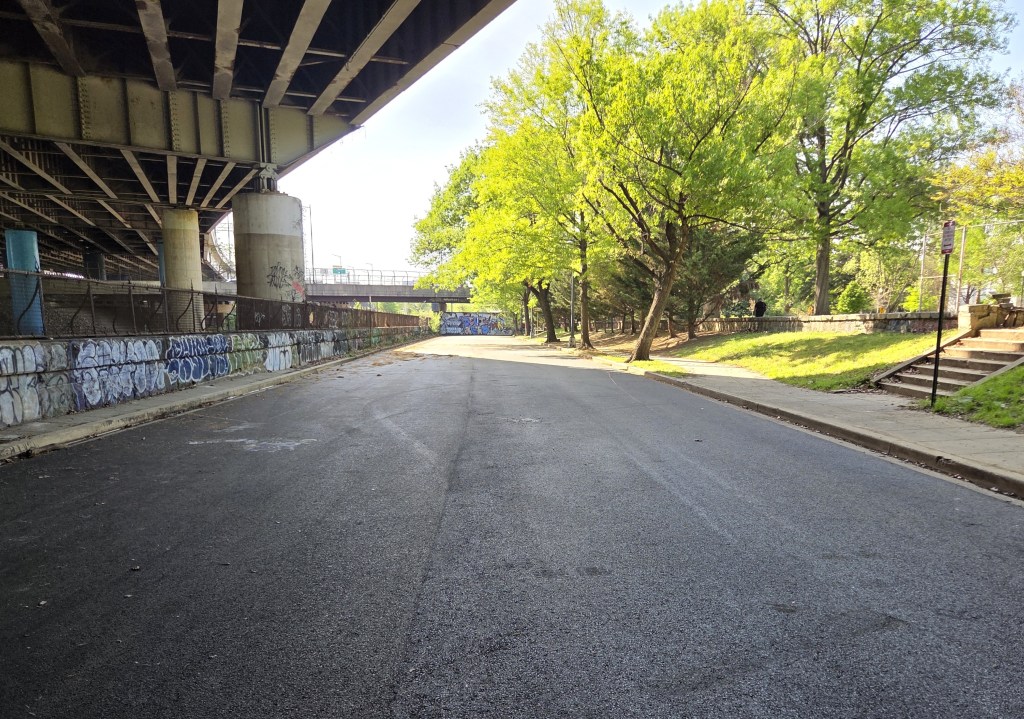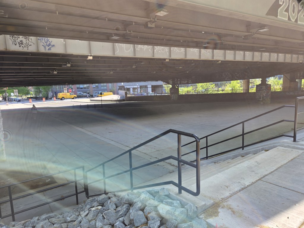 Garfield/Canal Park Update: The construction fence has been removed, and the work of opening up and clearing the area under the freeway appears to be complete. This view is of the steps leading down from the Garfield Park playground and looking south beneath the freeway.