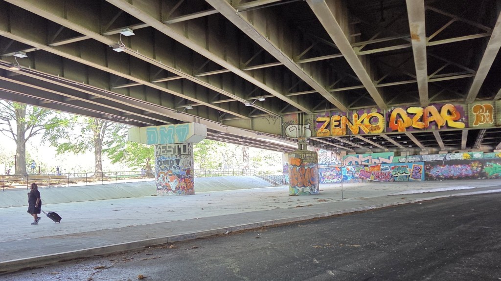 None of the amenities have been installed, but basketball and pickle ball courts reportedly have been funded and are on track to become a reality. Here’s a view from under the freeway looking northeast toward the stairs leading up to Garfield Park. The basketball courts will be here.