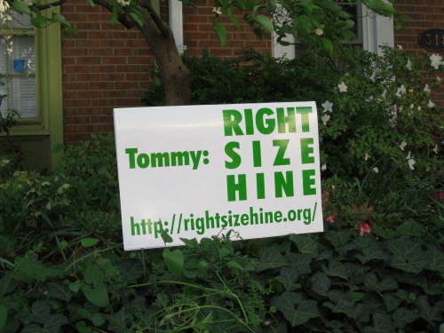 The signs, part of EMMCA’s political messaging campaign on Hine, read “Tommy: Right Size Hine,” and list a website for interested parties to view (http://rightsizehine.org/).  The decision to move forward with the signs, and to direct them toward Tommy Wells, was made once the Office of Planning (OP) recommended proceeding with the zoning change for the site without taking issue with the height of the proposed Hine Development put forward by Stanton/Eastbanc.
