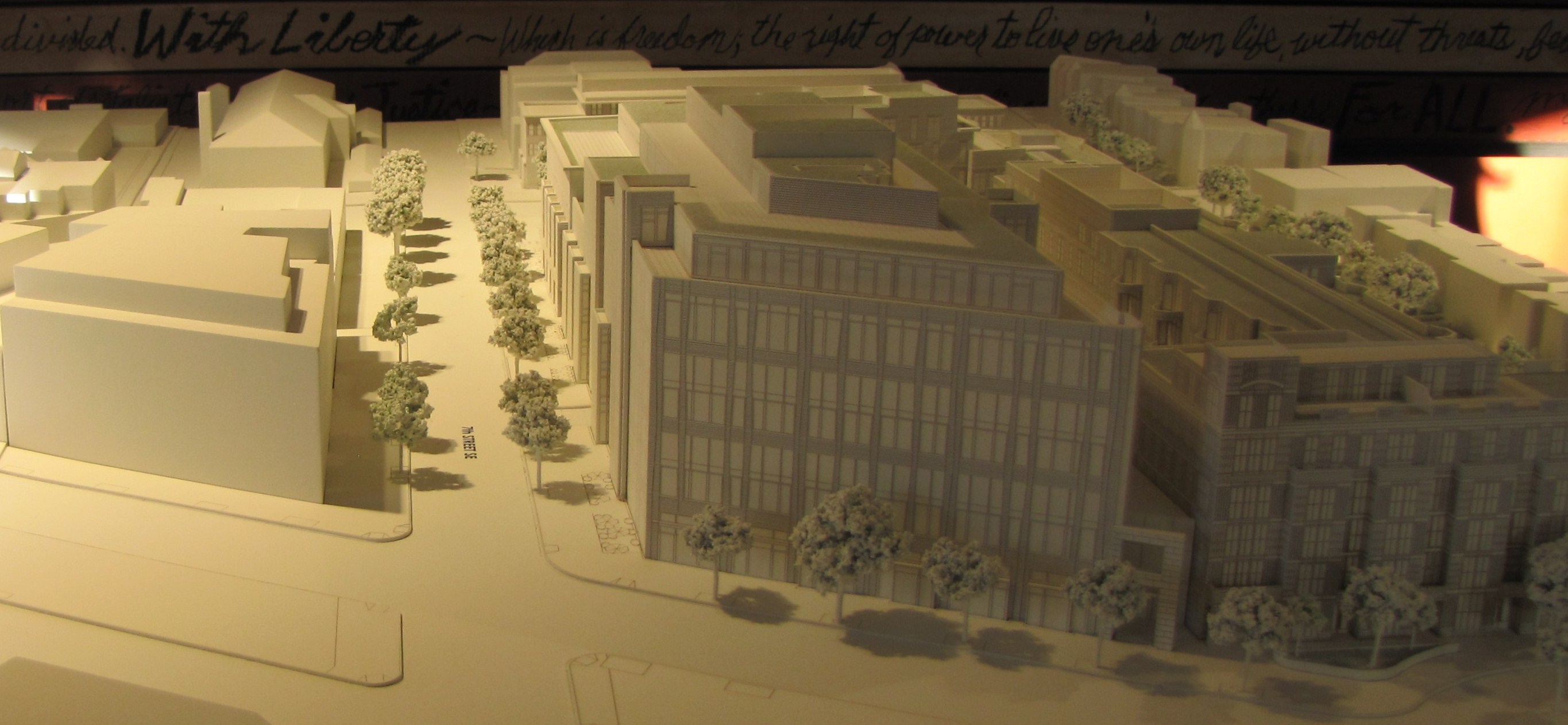 The statement concludes with a reference to the 2009 Stanton/Eastbanc proposal, a plan which CHRS supported.  But as they note in their HPRB testimony, that earlier proposal was six stories on Pennsylvania Avenue, with a sixth story deeply set back on 7th Street and the Pennsylvania Avenue corner.  Stanton/Eastbanc’s current plans call for an office building that is six stories with a 7th story set back 20 feet from 7th Street and only 12 feet from Pennsylvania Avenue.  Similarly, the plaza building on 7th and C Streets is five stories where it was once four, and it has crept onto 7th Street where it faces two story historic structures directly across the street.