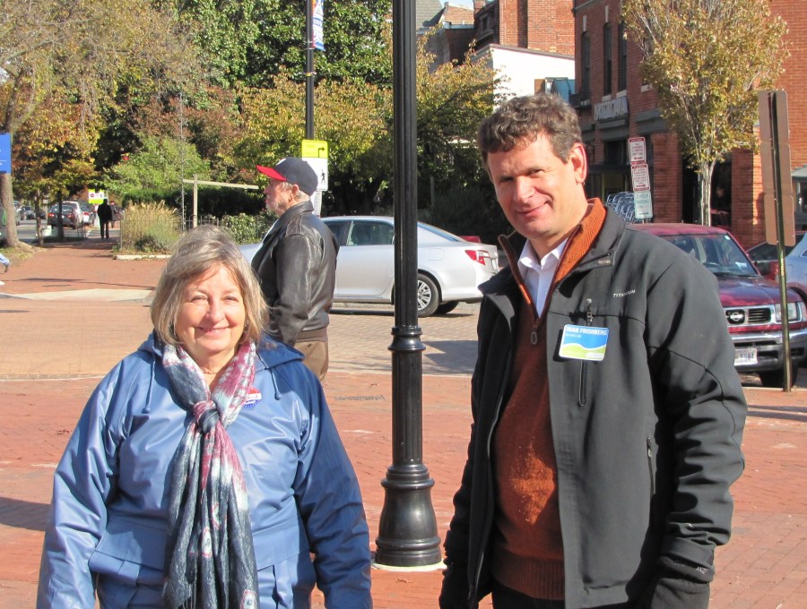 Eastern Market North Hall Polling Station, early afternoon. ANC6B candidate Ivan Frishberg and constituent.