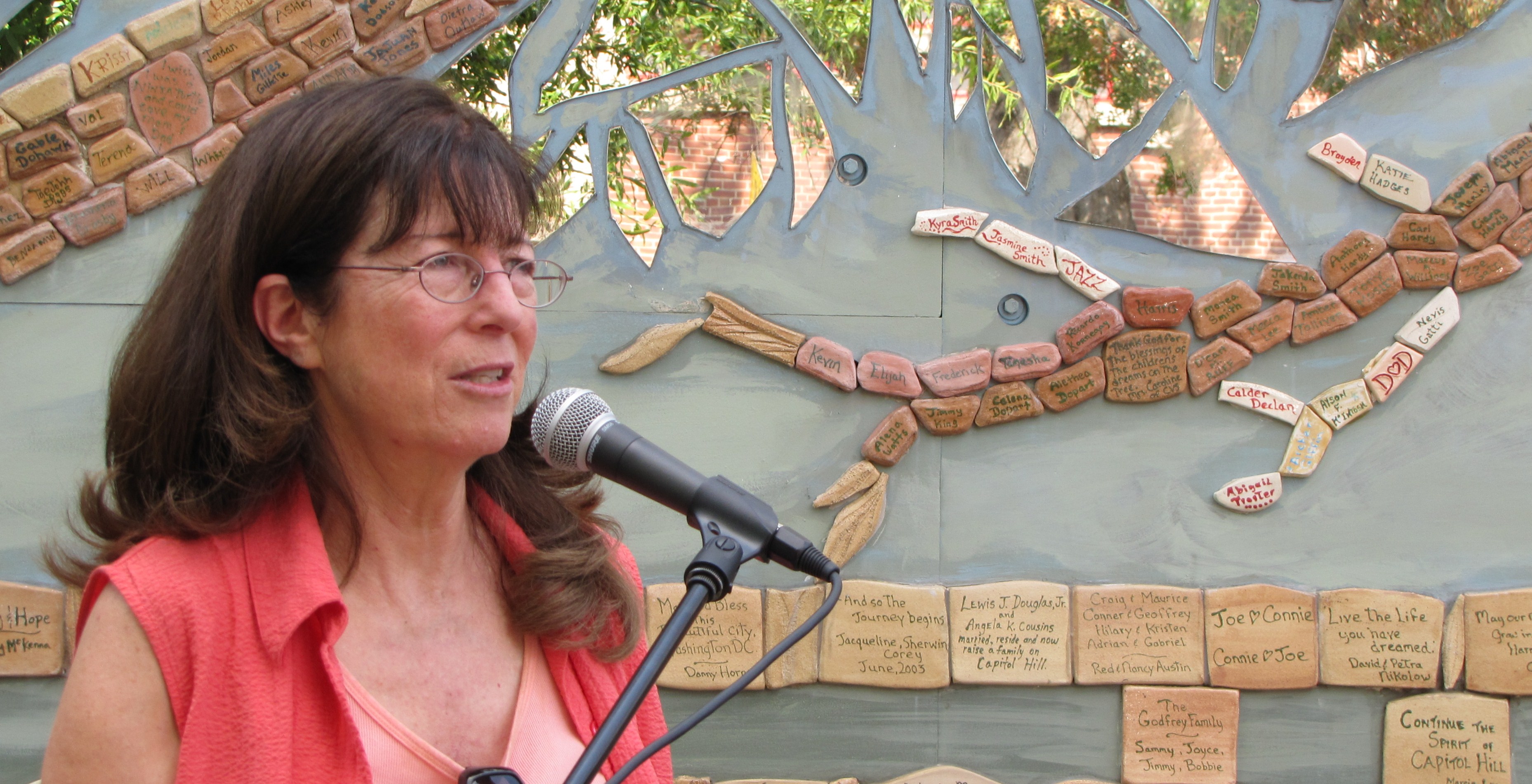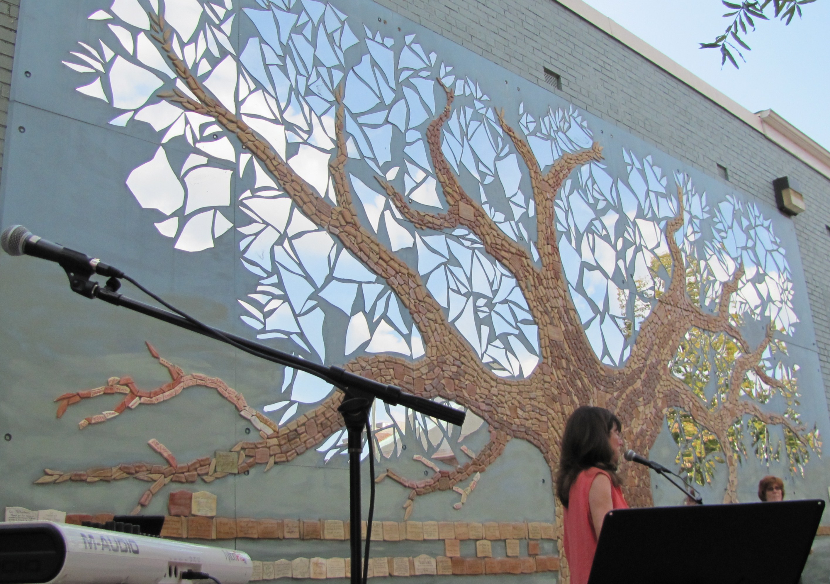 The Yume Tree on the north wall of the CVS at 12th and E Streets, SE, turned ten last week. Yesterday, the Corner Store – Kris Swanson’s and Roy Mustelier’s non-profit community art studio and performance space at 9th and South Carolina Avenue, SE – hosted an anniversary party to dedicate the community wall sculpture to Laurie Siegel. Kris Swanson, who conceived of the Yume Tree, spoke movingly of fused glass artist and award winning Watkins School art teacher Siegel – who succumbed to cancer in July – as one of her strongest allies in the project. Swanson recounted the story of how she was inspired to begin the work and how the tree came into being, crediting many in the community who played critical roles in overcoming obstacles to make it a reality.