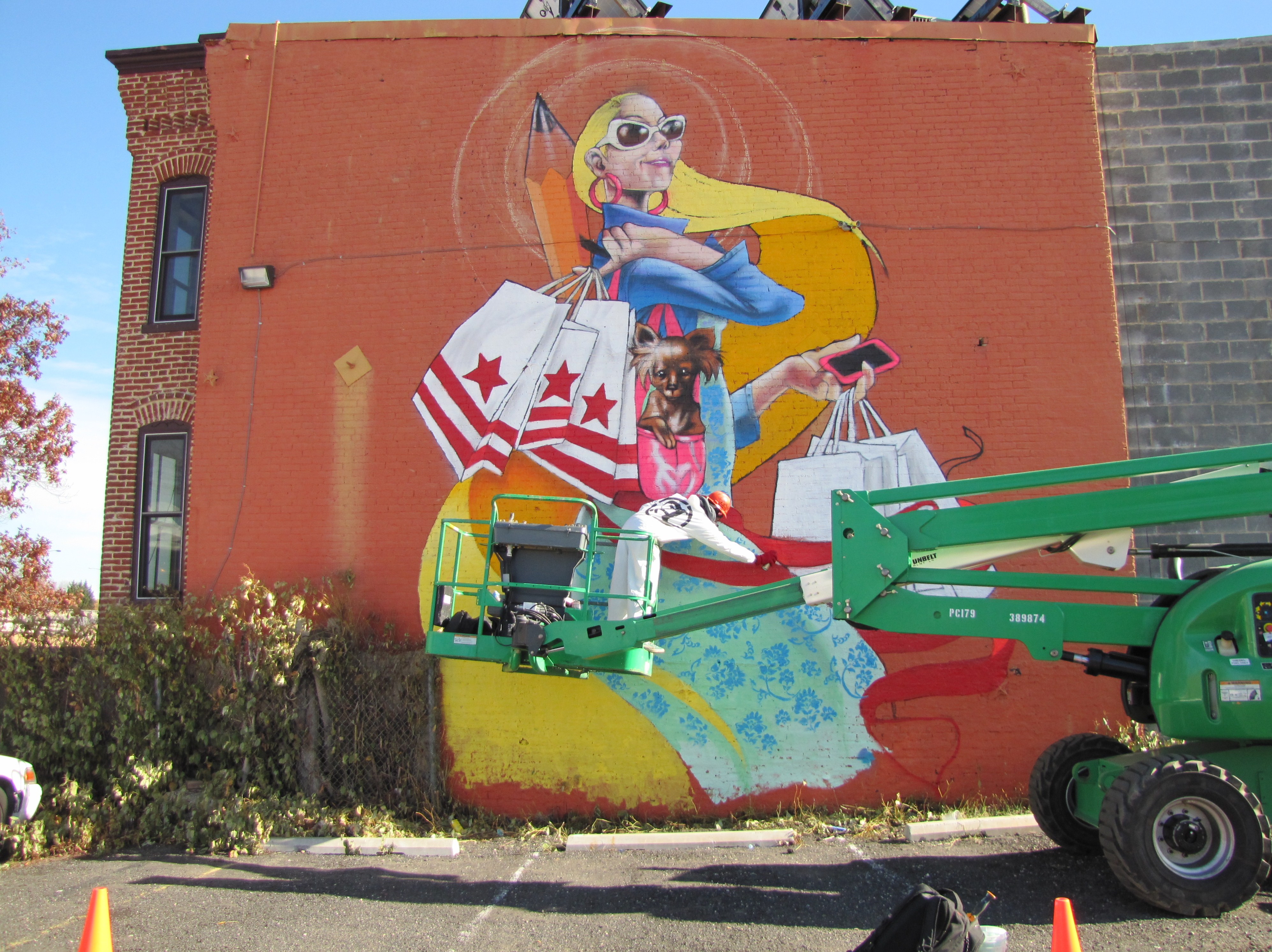 The theme of this aerosol-and-house paint mural features a happy modern young woman just returning from shopping with cellphone in hand. It incorporates shopping bags emblazoned with the stars from the DC City Flag, a pup recalling the nearby dog day care center. The sharpened pencil – about which more below – is a recurring image in the artist’s recent work.