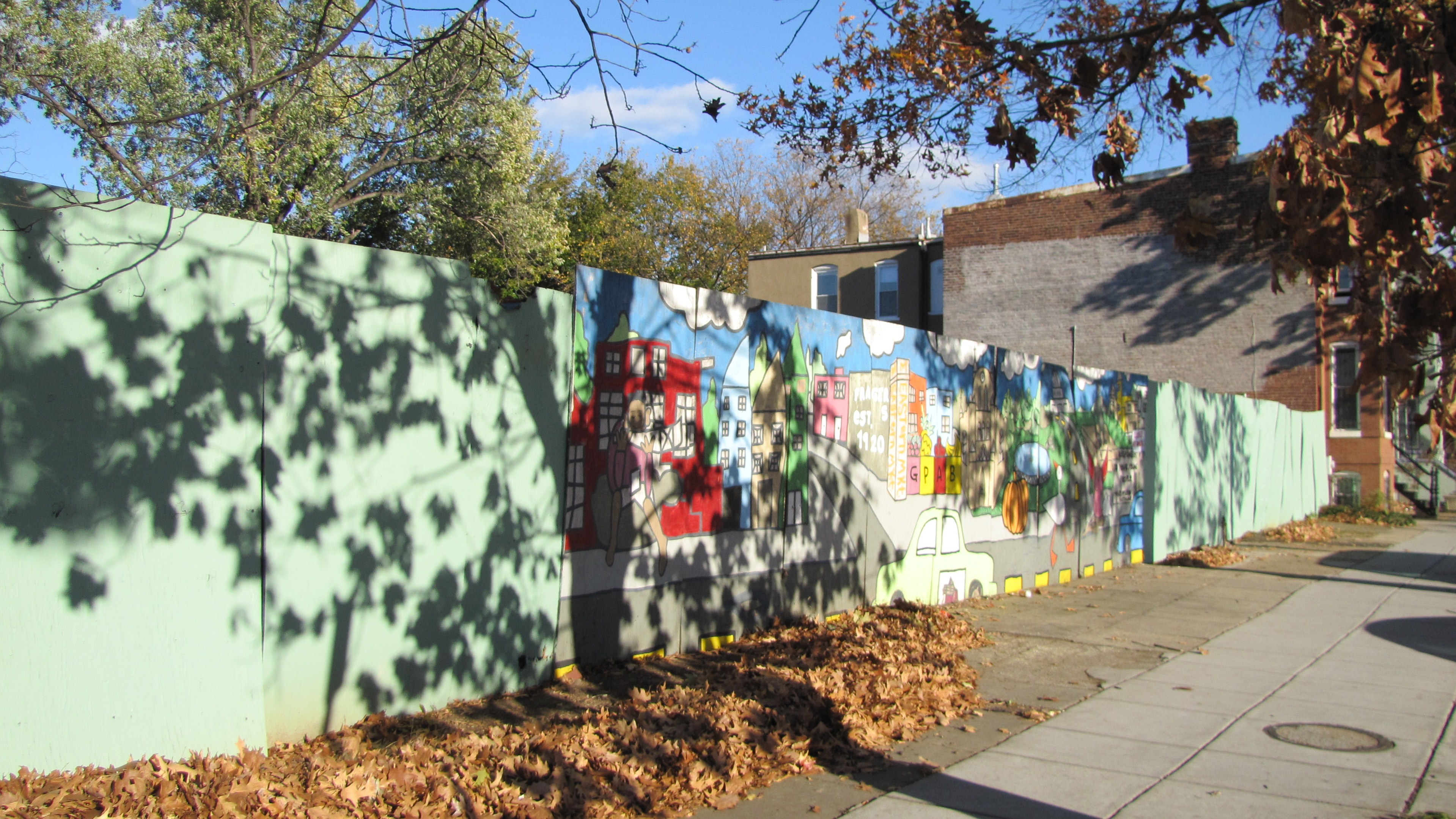 A new mural promoting local shopping went up today on the side of the building overlooking the commercial parking lot at 8th and Virginia Avenue, SE. It is highly visible for commuters waiting at the stoplight at 8th Street after taking the 6th Street exit from the SW Freeway.