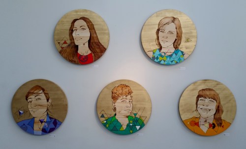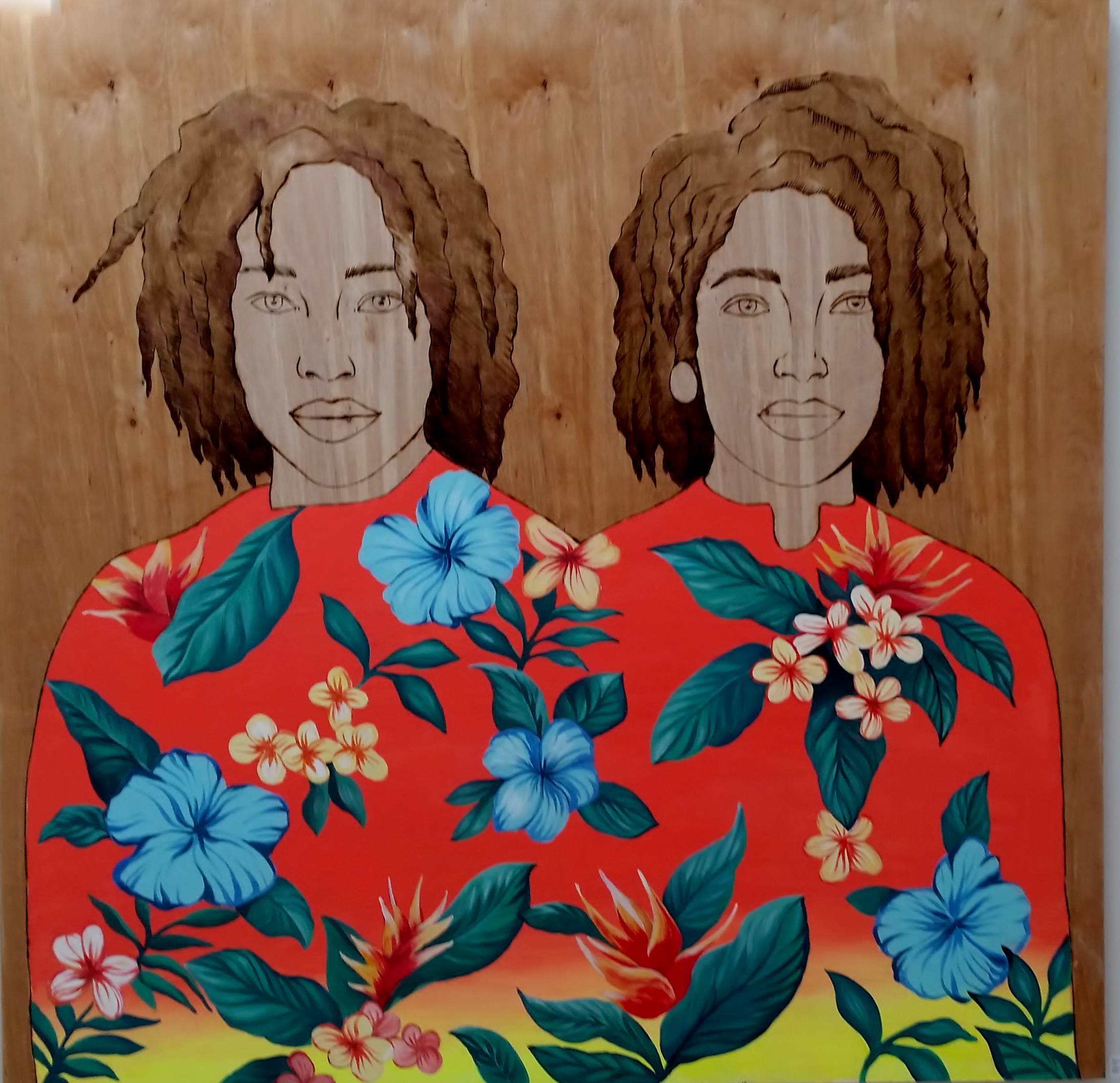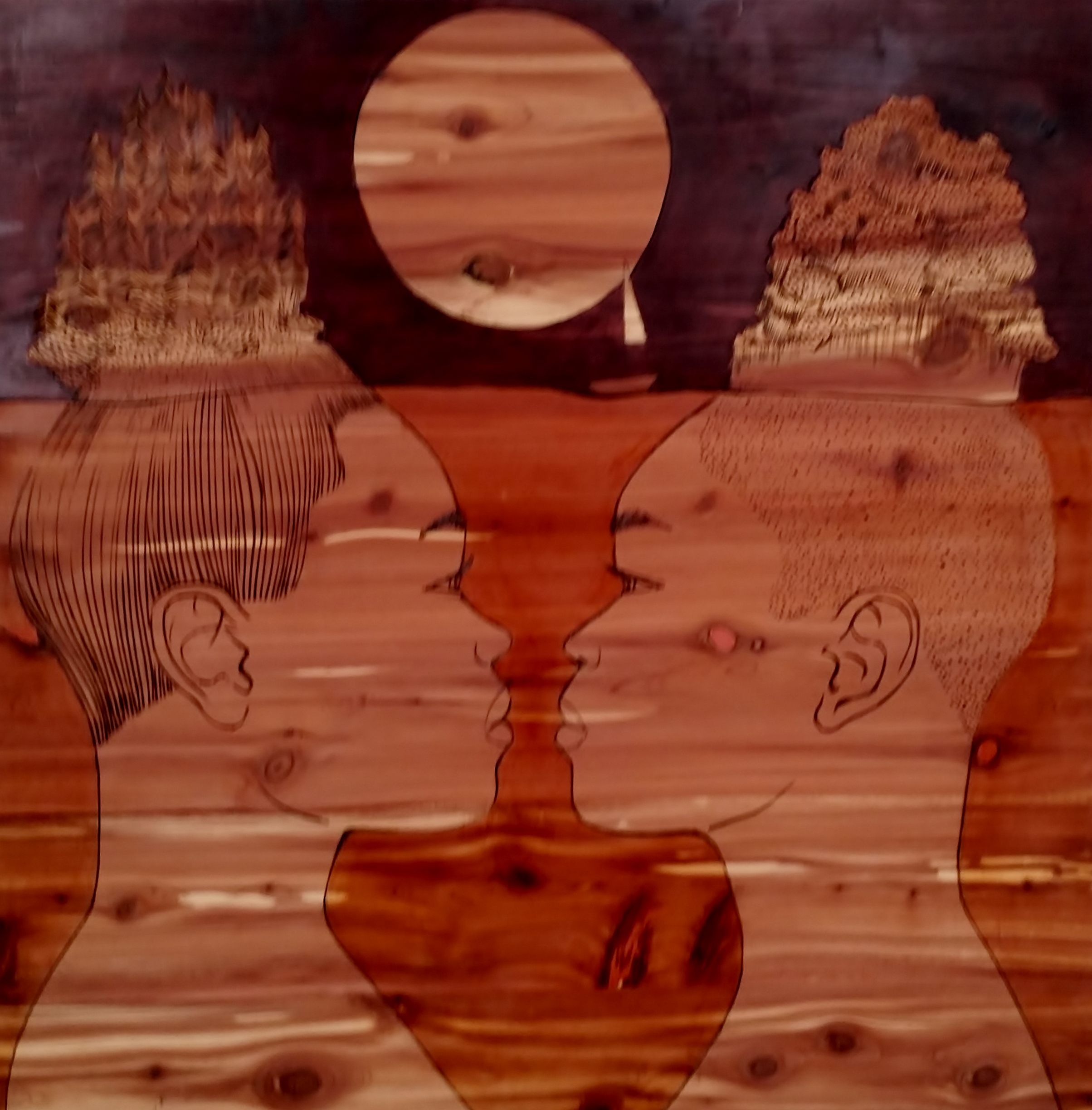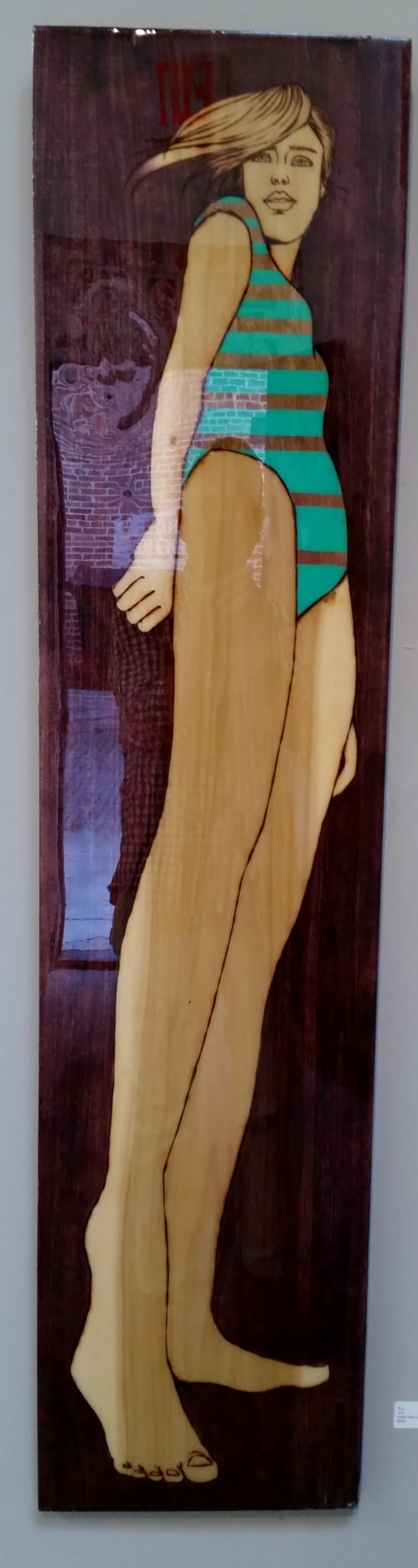 The surface is wood and the medium is burned wood and paint. The result is a synthesis of the synthetic and natural. Jaffe imprints images of women on the wood instead of painting them on top of it. She uses a wood burning tool for lining and then adds paint with a bold color palette evidently inspired by time spent in Latin America. In some pieces she adds another layer of meaning and complexity with “sacred geometry.”