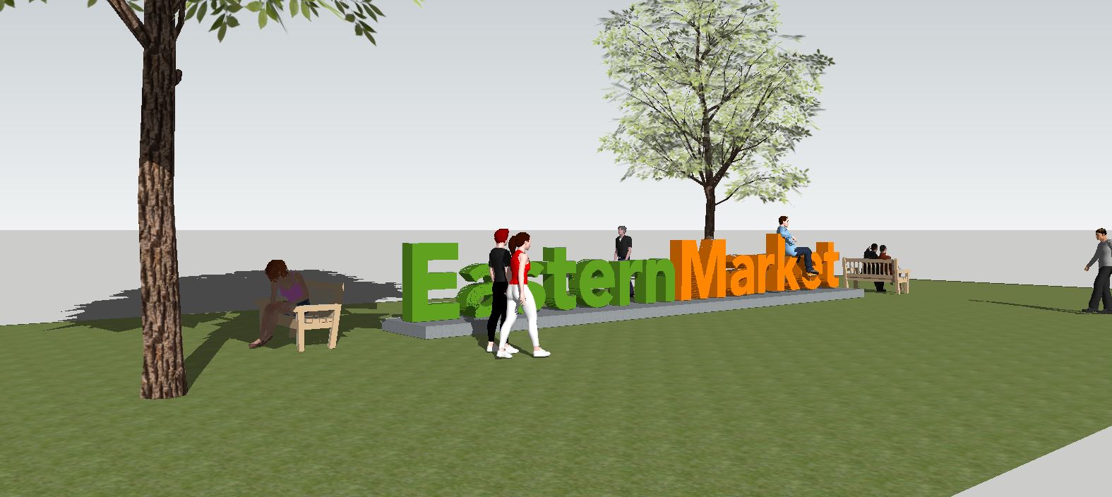 Martin Smith, Executive Director for BRMS (sort of a local Chamber of Commerce for Barracks Row) presented the concept to the committee in a bid for ANC and community support for the project. He told the committee the current ideas on the drawing board (pictured above) would provide interim beautification of the Plaza pending its redevelopment (See here: http://bit.ly/1duqZJd) and would become part of the design following completion of that redevelopment. As envisioned, the 36 inch-high letters comprising the pieces would be fabricated from polycarbonate, and would serve a marketing and branding purpose for both Barracks Row and Eastern Market. Smith said the pieces would be interactive for both children and adults. The grant requires matching funds, and BRMS would have to raise half the projected $200,000 cost of the project.