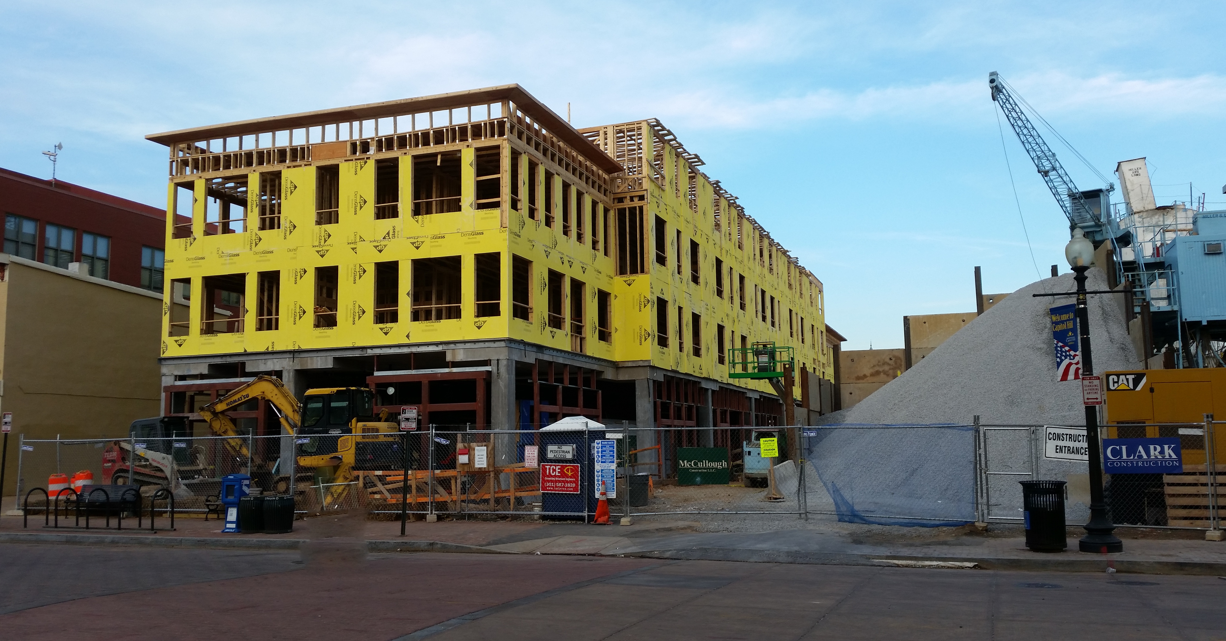 The Hine Project’s North Building – controversial because it will house almost all of the Hine Project’s affordable housing (which should be distributed throughout the project) begins to take shape on what will be the re-opened C Street between 7th and 8th Streets, SE. The first floor of the North Building will be retail. Half the residential units above will be affordable housing for seniors.
