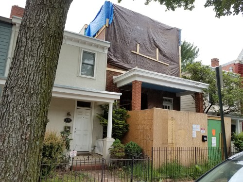 In February, the Department of Consumer and Regulatory Affairs (DCRA) issued a permit for a pop up addition in the Capitol Hill Historic District and then issued a stop work order after the construction was well underway. DCRA issued permits to Blue Star Design Build, owned by Eric and Christal Goetz, for an addition to a townhouse at in the Capitol Hill Historic District at 231 10th Street, SE.  Since the property lies in the Historic District, the permit application should have been referred to the Historic Preservation Board (HPRB) for review, just as a second application to construct a two story garage on the property had been.   It wasn’t (perhaps this should have been a tip off to the developer who has done other projects on Capitol Hill), and the applicants proceeded with the work on the addition.  After a stop work order was issued, Blue Star backtracked and filed a Historic Preservation Application with HPRB in March.
