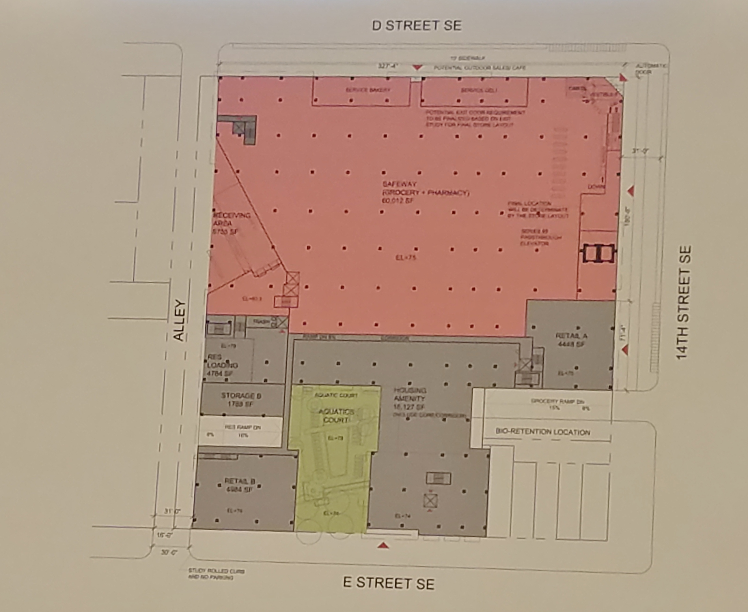 • All parking will be below grade and residents will not be eligible for Ward 6 Residential Parking Permits. Currently there are 155 parking spaces on the Safeway parking lot. This will increase to 194 parking spaces for the retail component of the project which will be accessed from 14th  There will be an additional 170 spaces for residential parking, accessed from the alley – two separate entrances and two separate parking levels.