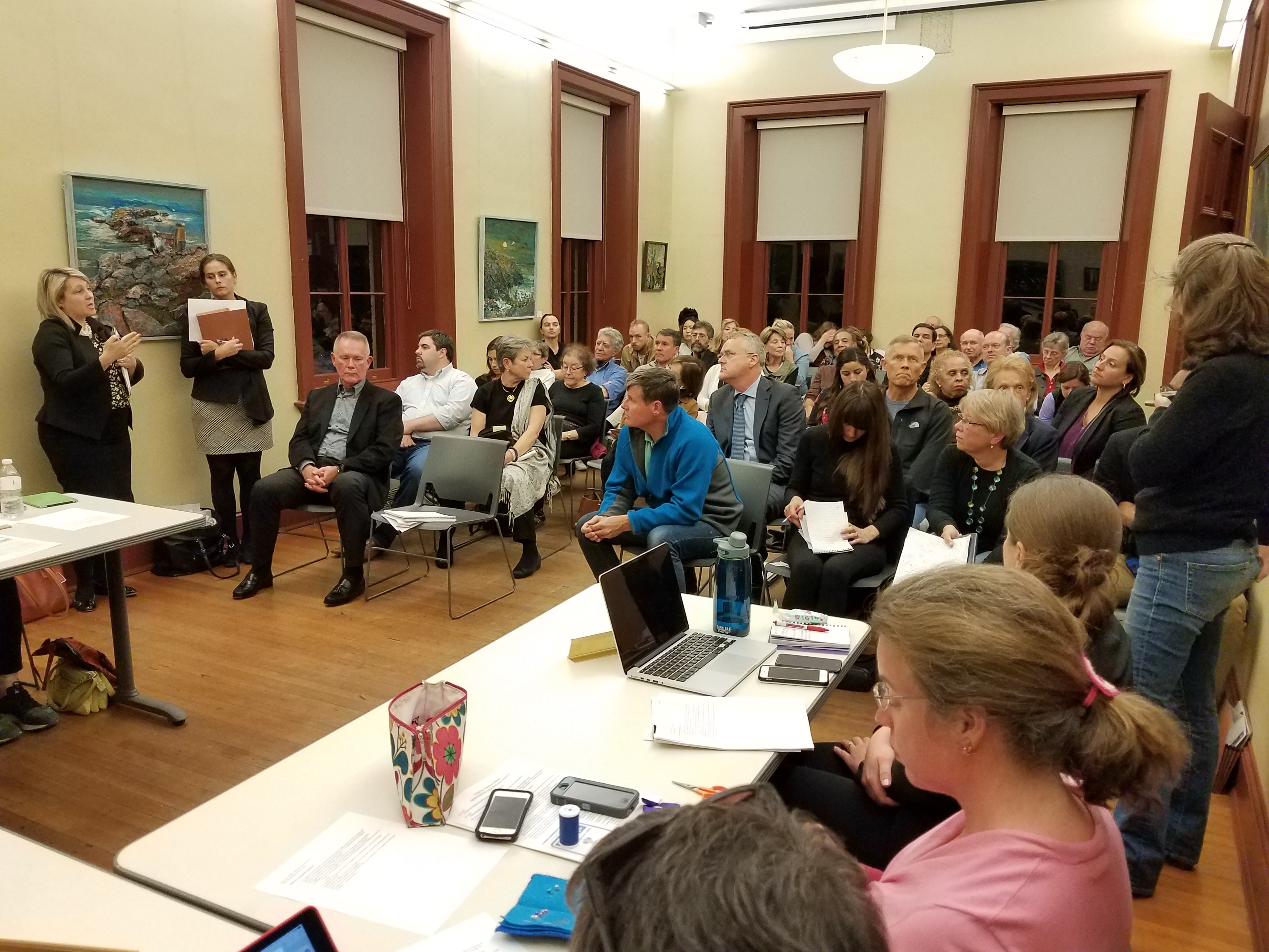 Residents listen to Congressional Hispanic Caucus PAC counsel Meridith Moldenhauer (standing, far left) at last night’s ANC6B meeting…