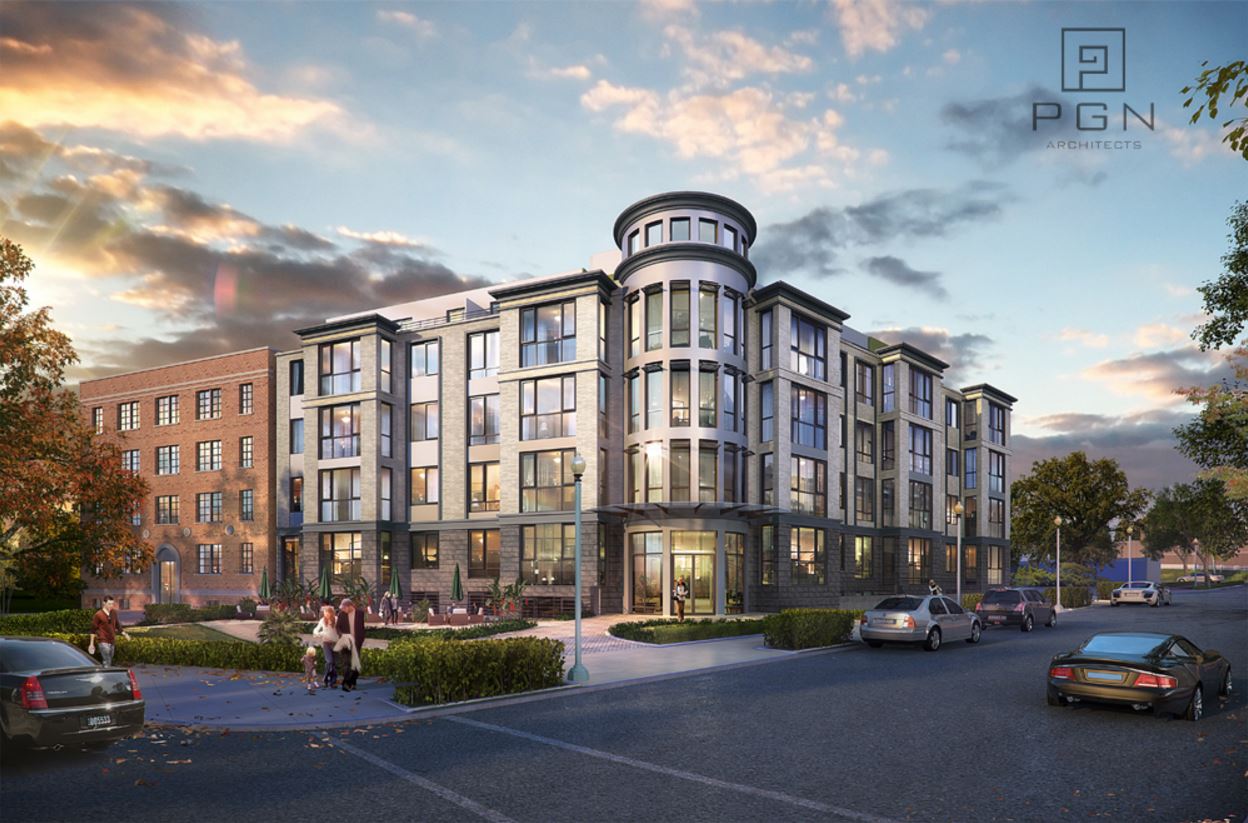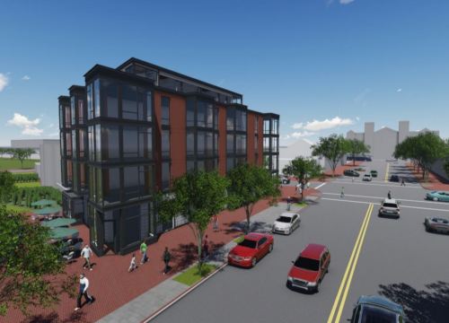 Here’s the architect’s rendering of the finished project. The 20 residential condo units will consist of a mix of 1 bedroom, 1 bedroom and den, and two bedroom units. The top floor penthouse will feature studio spaces, each with a private roof terrace. Ten parking spaces will be provided. The 5,000 square foot first floor of the building will feature two retail spaces. The building is across the street from the popular beer garden, The Brig.