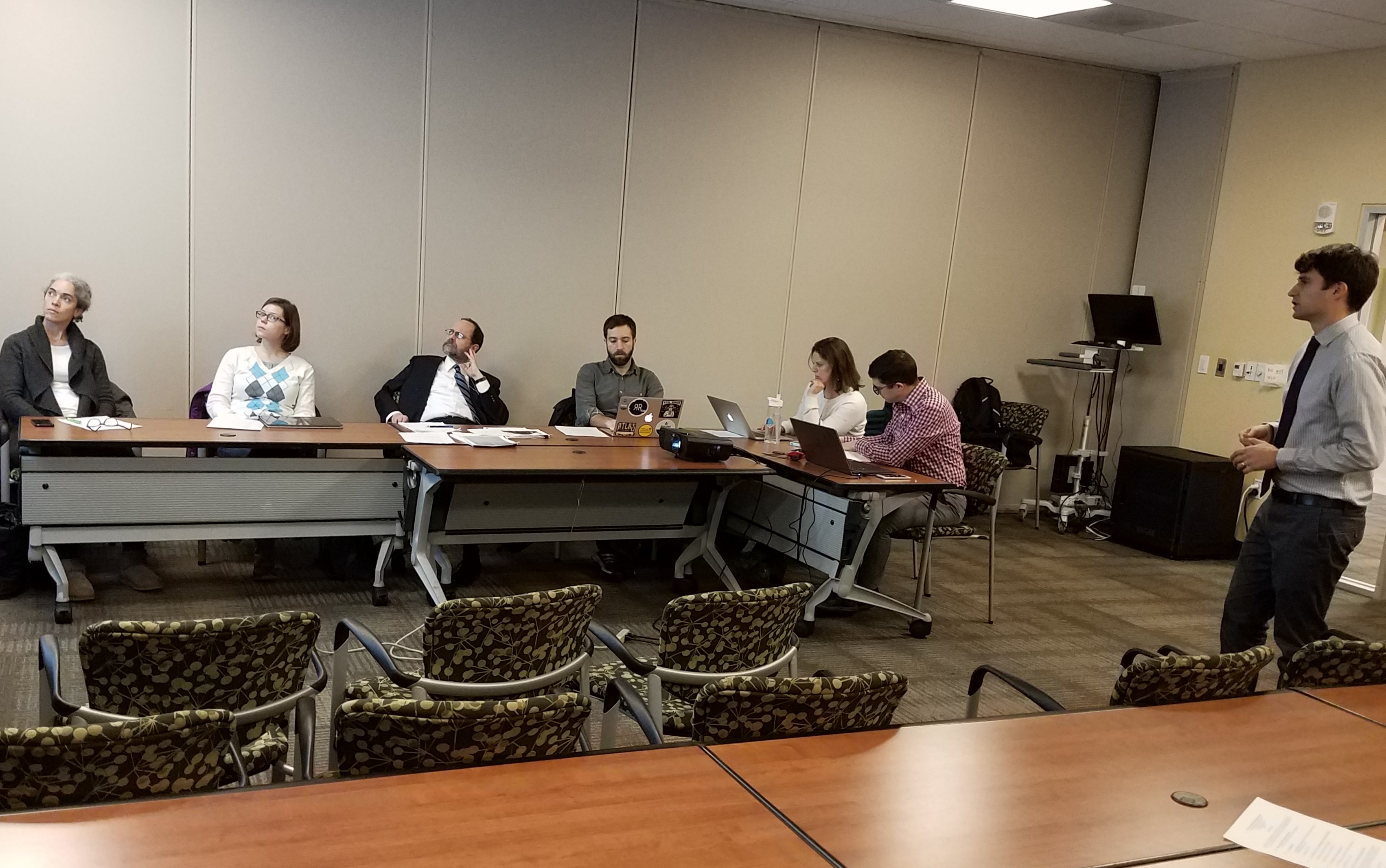 ANC6C Transportation Committee. Members, left-right – Heather Edelman, Kate Kemmerer, Mark Eckenwiler, Josh Linden (co-chair), Emily Diamon-Falk, Mark Kazmierczak (co-chair). Standing, Jonathan M. Robers, DDOT Policy Analyst
