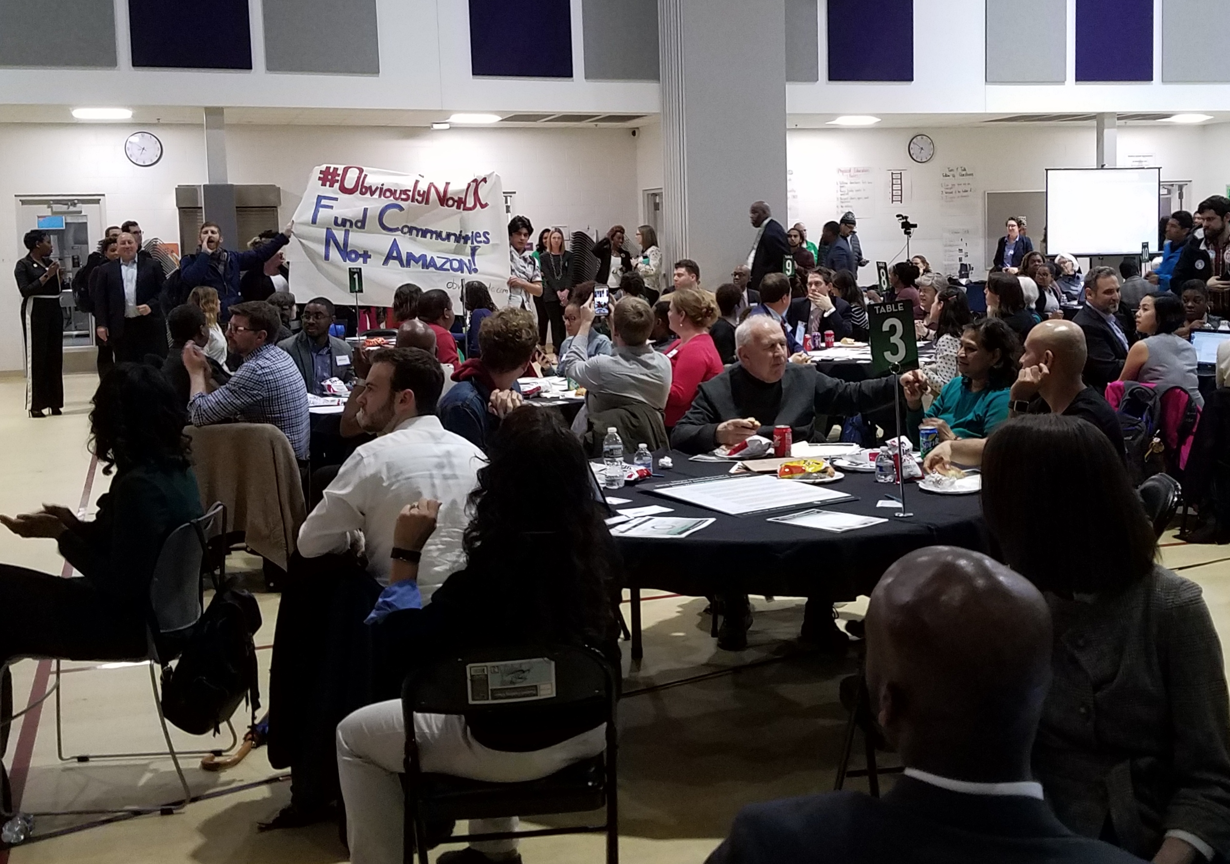 Bowser had begun to address the more than 200 residents who were participating in what she called the effort of “helping us balance the budget” when protestors sitting near the stage where Bowser was speaking, rose and unfolded a sign that said “Fund Communities Not AMAZON!” and the hashtag “#ObviouslyNotDC”. ***