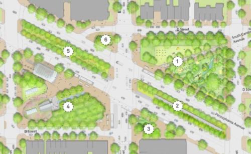 The Plaza redesign plan involves multiple city and federal agencies, including DGS, the Departments of Parks and Recreation, Transportation, Energy and Environment, the Office of Planning, the Office of Zoning, DC Public Libraries, and the Historic Preservation Review Board. Federal agencies include the National Park Service, National Planning Commission, and the US Commission on Fine Arts.