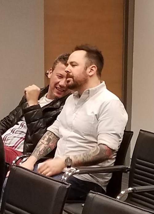 Celebrity chefs Bart Vandaele (Belga Café), and Aaron Silverman (Rose’s Luxury, Pineapples and Pearls, and Little Pearl) share a moment while waiting their turn to support renewal of their liquor licenses before ANC6B’s ABC Committee.