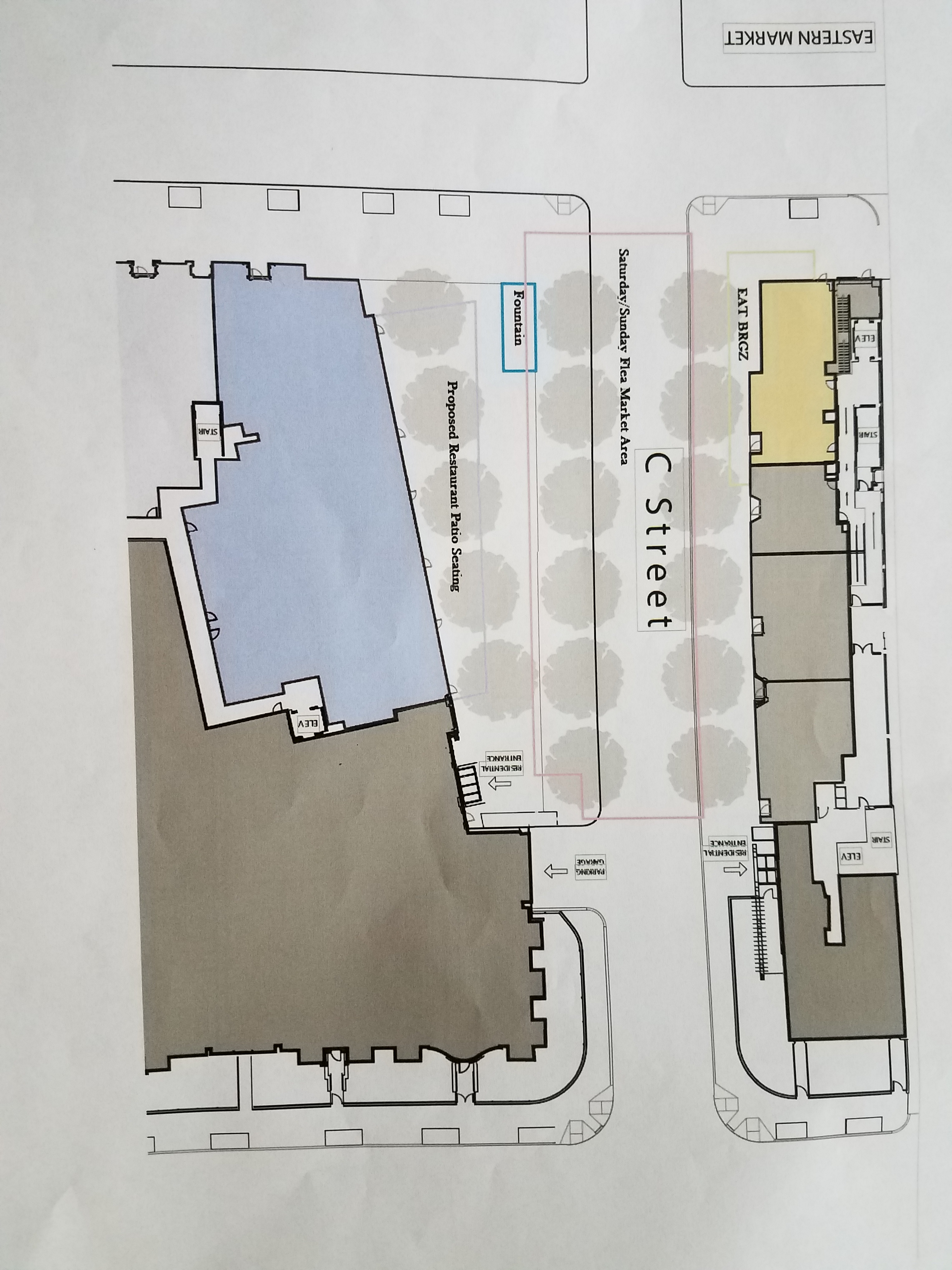 Silverman said noise abatement would be limited to umbrellas over outdoor seating for now and that there will be no entertainment or outside speakers. The kitchen will close at 10 to 10:30pm on week nights and 11 to 11:30pm on Friday and Saturday. Engineers are looking at how best to vent cooking odors, but scrubbers (air pollution control devices) are cost prohibitive. The outdoor seating will not be in the way of the splash pad or the flea market. All the outdoor seating will be fenced off with planters and located on the C Street side, none on the 7th Street side, and the outside area will be cleaned nightly after service is concluded.