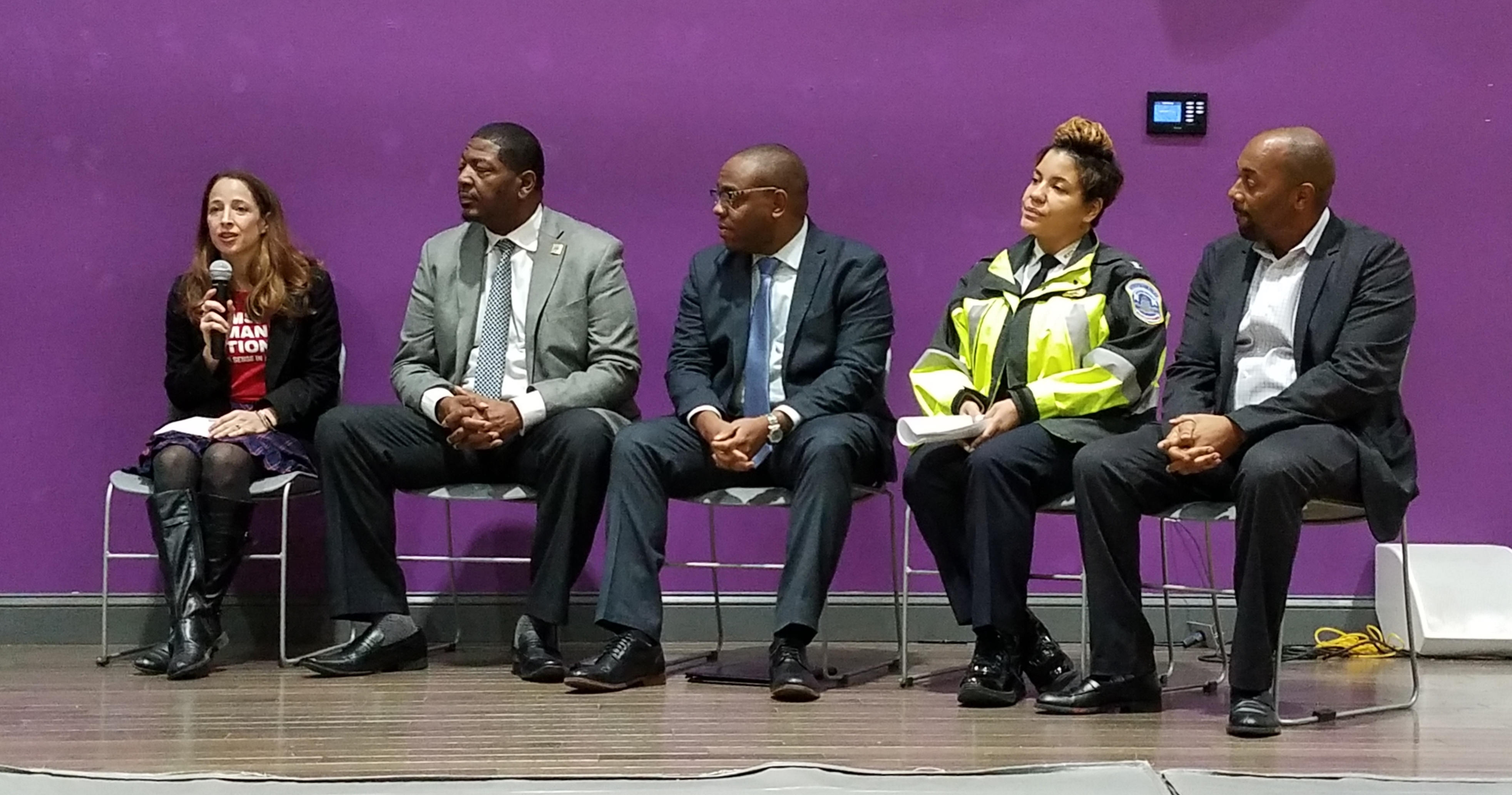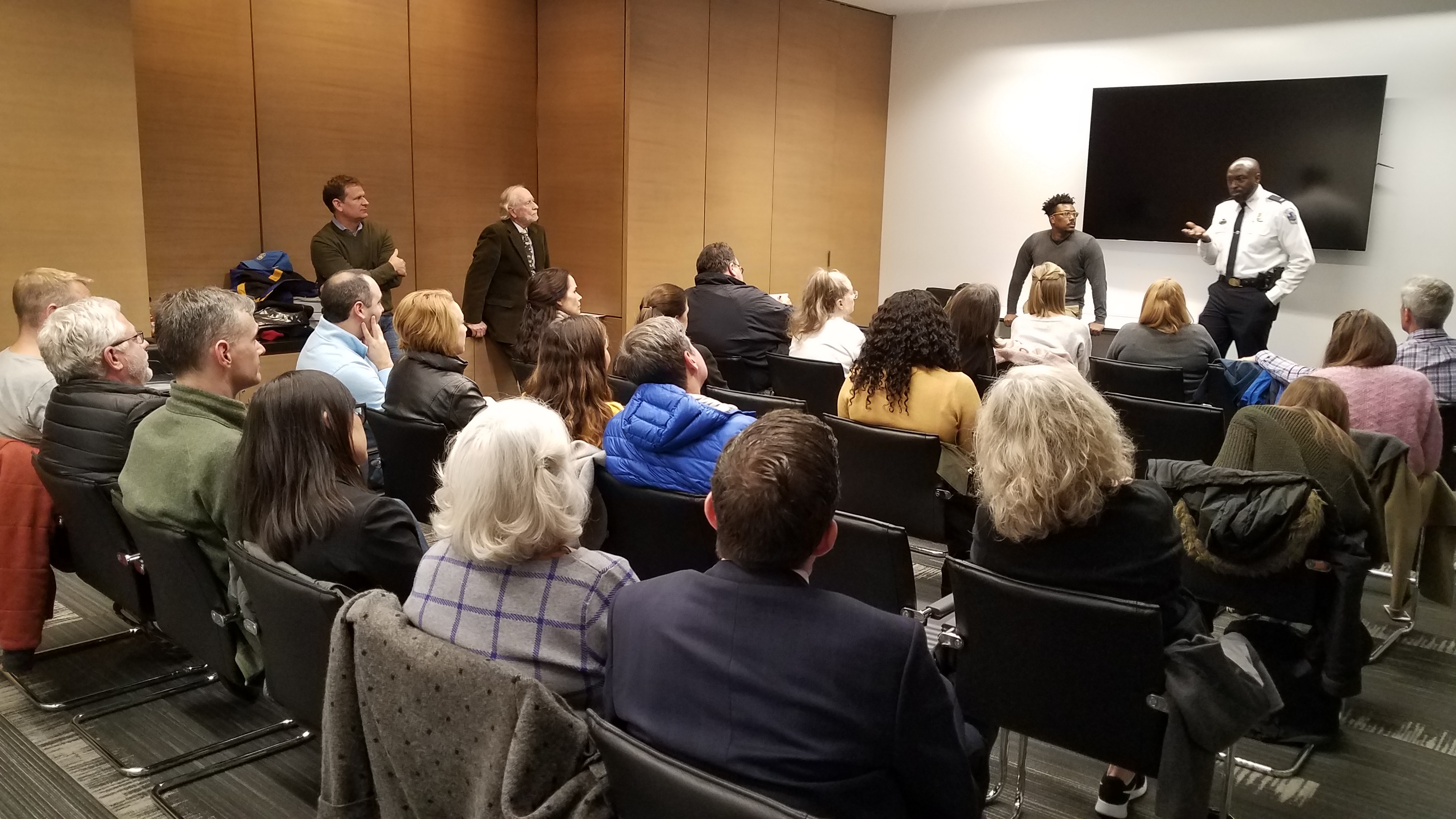 Monday night’s community meeting on the removal of the encampment near CVS. Standing, left to right, former ANC6B Commissioner Ivan Frischberg, ANC6B Commissioner Jerry Sroufe, ANC6B Commissioner Brian Ready, Lt. Damian Taylor.