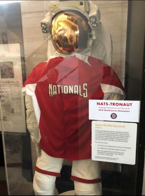 A new exhibit at the Air and Space Museum celebrates the World Series Champions with this newly-garbed Space Shuttle Space Suit replica. Photo: Tom Donovan.
