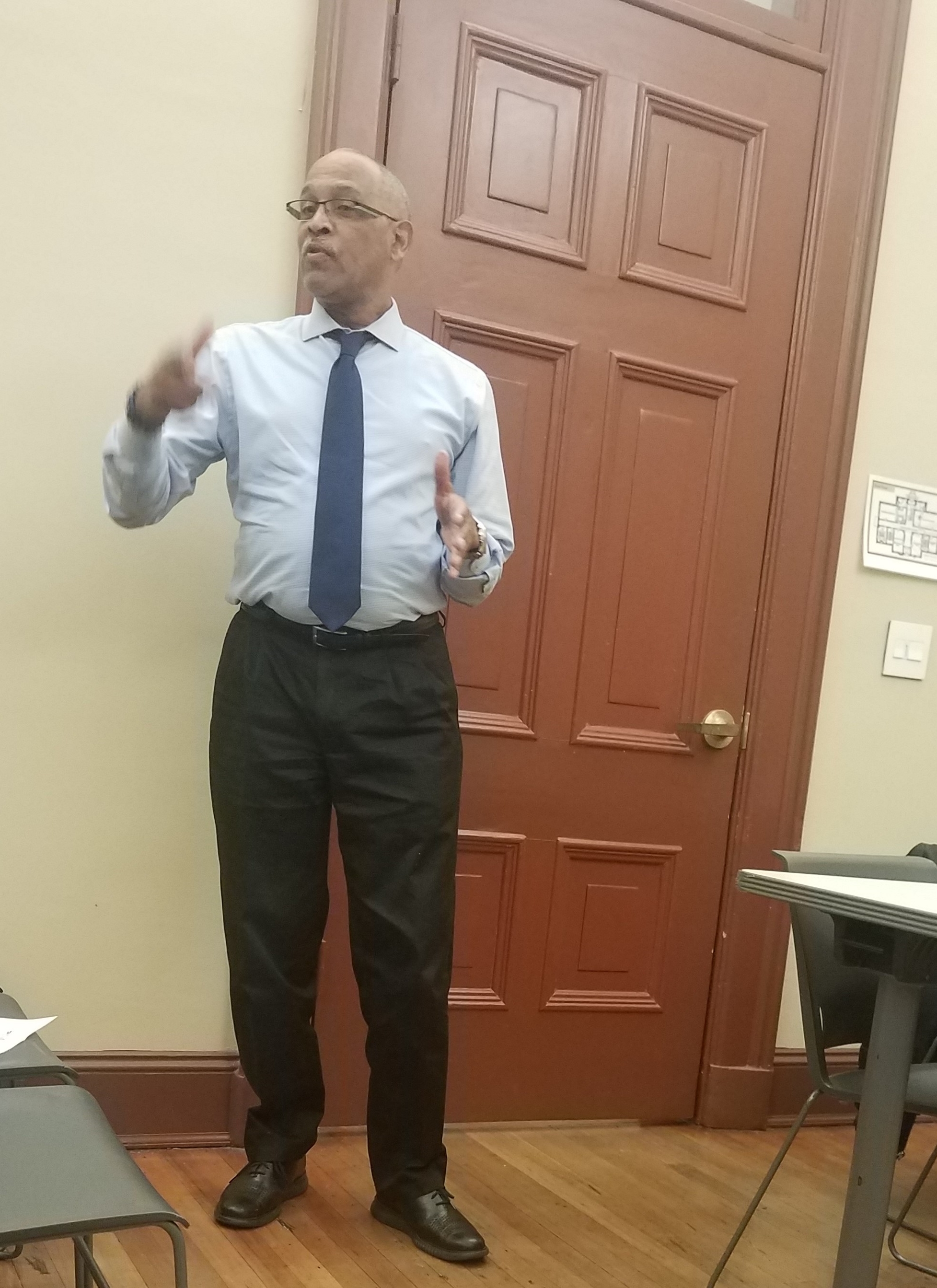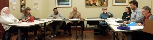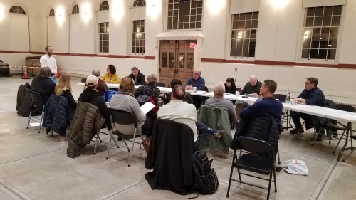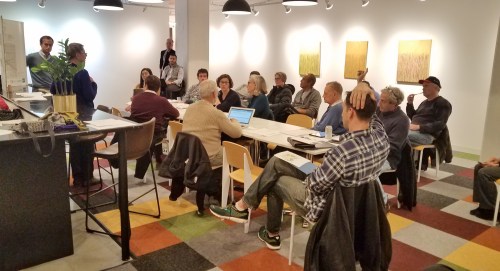 Scott Betz, of Architrave, standing at left, reports the status of work on the Eastern Market Strategic Plan to the Eastern Market Community Advisory Committee last Wednesday night.