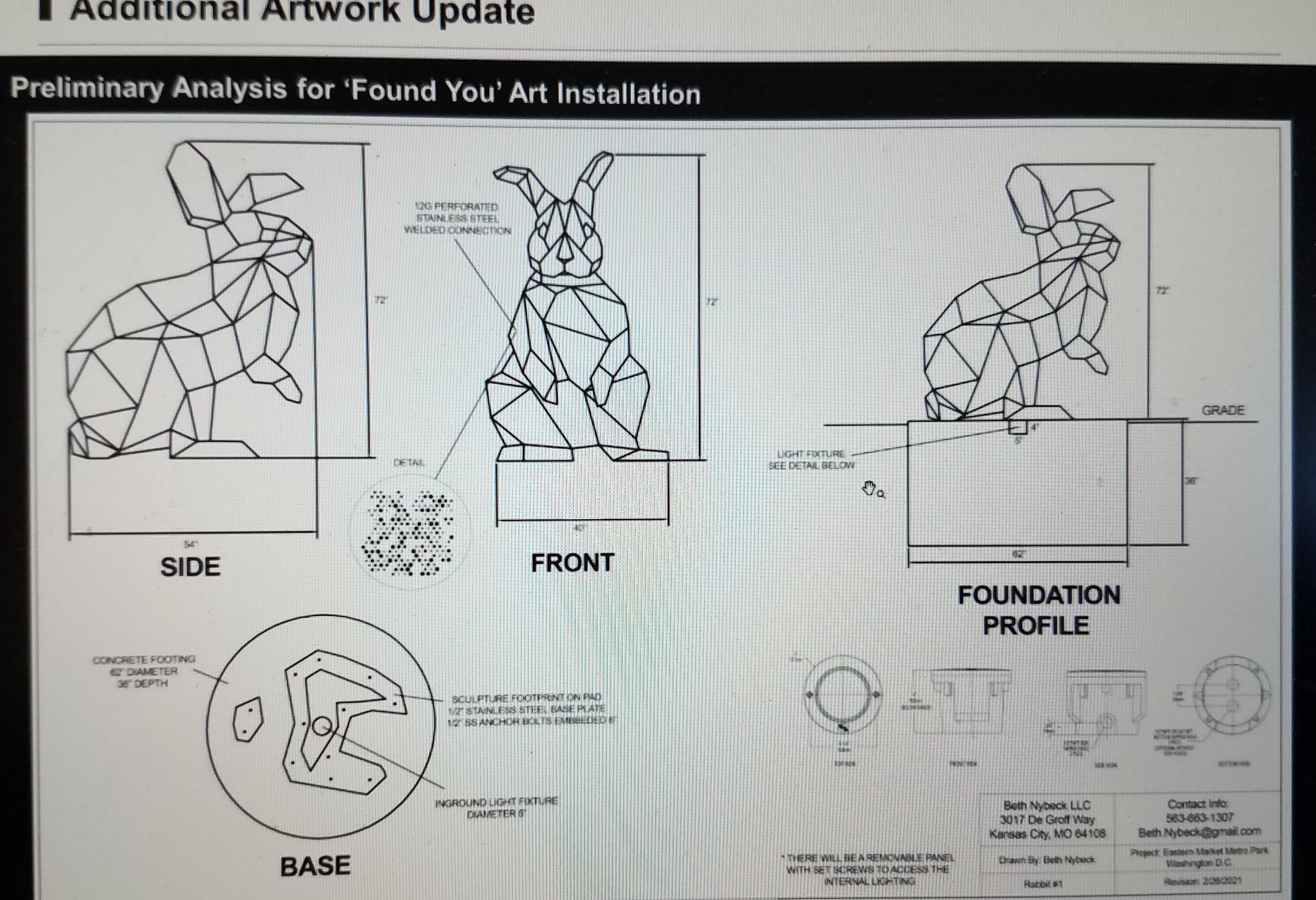 DGS briefed the Eastern Market Metro Park Taskforce on Wednesday on the renovation of the Eastern Market Plaza. There are weekly meetings regarding the fabrication of the two pieces of public art. The city is funding “Loveful Hands” by Jay Coleman for Parcel 4 near the Metro entrance, and Barracks Row Main Street is funding “Found You” – three rabbits playing hide and seek by Beth Nybeck– to be installed near the playground on Parcel 1. The pieces will be fabricated over the summer and installed late summer or fall. Project Manager Diego Martinez said there was no update on a potential third installation – “Weavings” by Hiroshi Jacob – near Trader Joe’s. Dave Perry of Barracks Row Main Street said Barracks can’t commit to funding “Weave” at this point, but “conversations continue.” DGS is projecting a late spring grand opening for the renovation project.