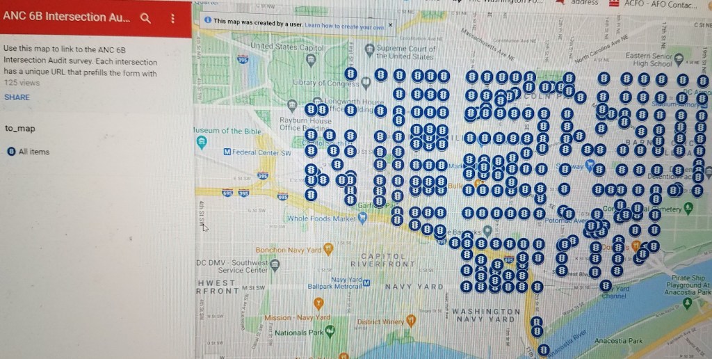 Commissioner Kirsten Oldenburg’s ANC6B’s Transportation Committee met on Wednesday and resident member Brian Kirrane unveiled an interactive internet tool to assist in an ANC6B intersection audit. He gave Mark Sussman much credit for technical assistance in the development of the tool and said they were closing in on a launch date. The purpose of the tool is to collect data on the details to evaluate how each of the some 270 intersection in ANC6B is managed to help the ANC assess future traffic management needs. The tool will seek input from nearby residents of each intersection on how traffic is regulated, the timing of traffic signals, and details on crosswalks, ramps, and safety bollards. Kirrane said other ANC’s might find the tool useful. See below.