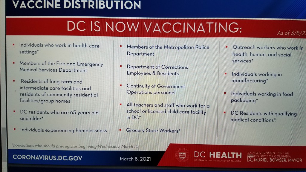 Mayor Bowser announced today that the city’s new preregistration procedure for vaccination appointments for eligible groups starts Wednesday, March 10.
