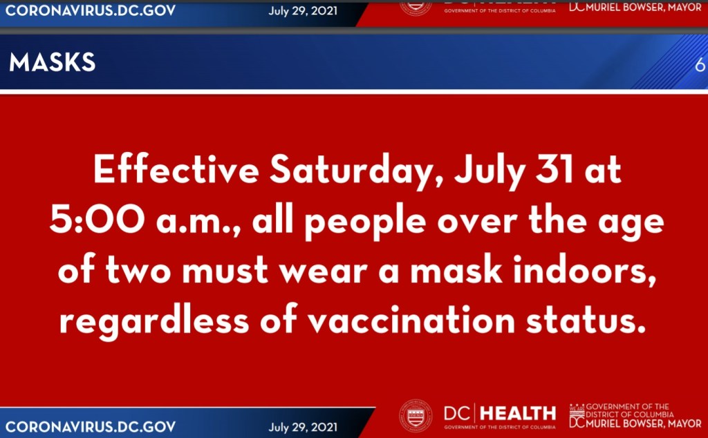 Today, Mayor Bowser announced that starting Saturday, July 31 at 5:00am, she would order mandatory wearing of masks indoors for everyone over the age of two, regardless of vaccination status. The public emergency remains in place. As of now, only the masking requirement changes, with no change in the social distancing requirement.