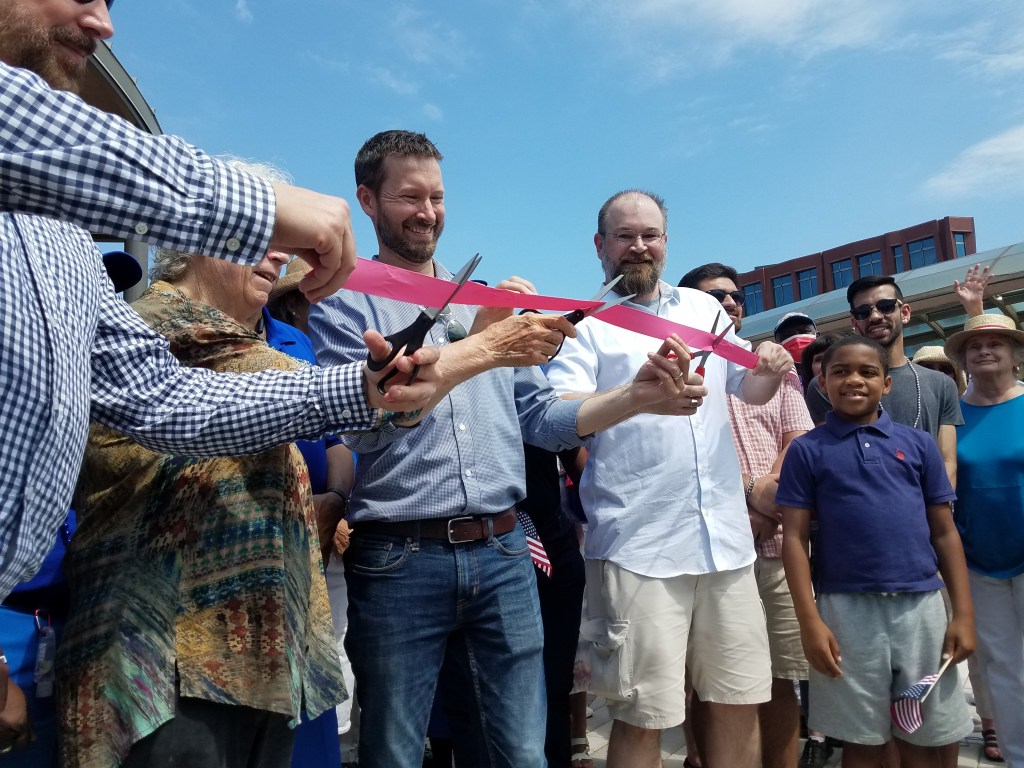 After the Mayor departed for another parade in Palisades, Allen said that the community had been presented with a rare opportunity to change the nature of the space. He said “We can do the big stuff, but we can’t forget the small stuff”. He cited the preservation of one of the benches (from the parcel which now accommodates the playground) which had been restored by neighbor Peter Riehle as a Eagle Scout project a few years before his death in 2015. “That’s who we are”, Allen said, “remembering the small things that hold us together in addition to the big stuff”. Above, Allen along with Martin Smith of Barracks Row Main Street and Nicky Cymrot (partly obscured) cut a ribbon – the City Council’s recognition of the official opening of the Plaza.