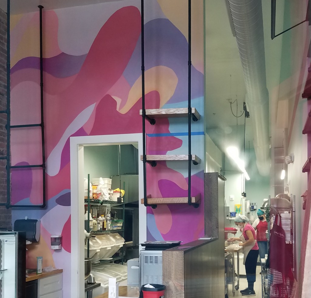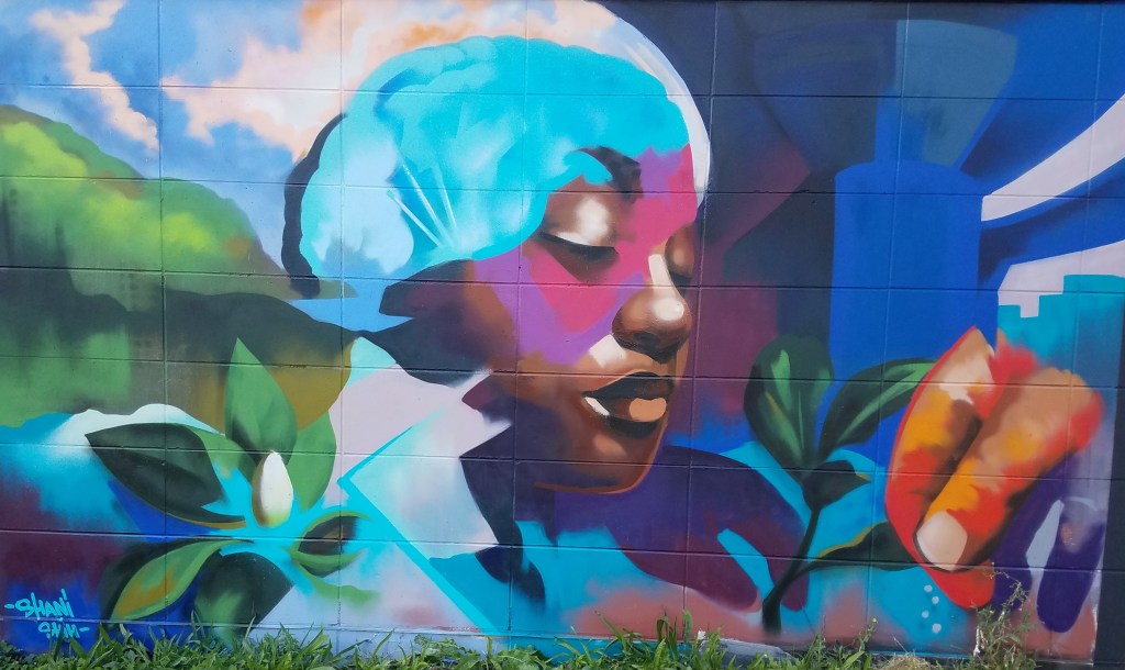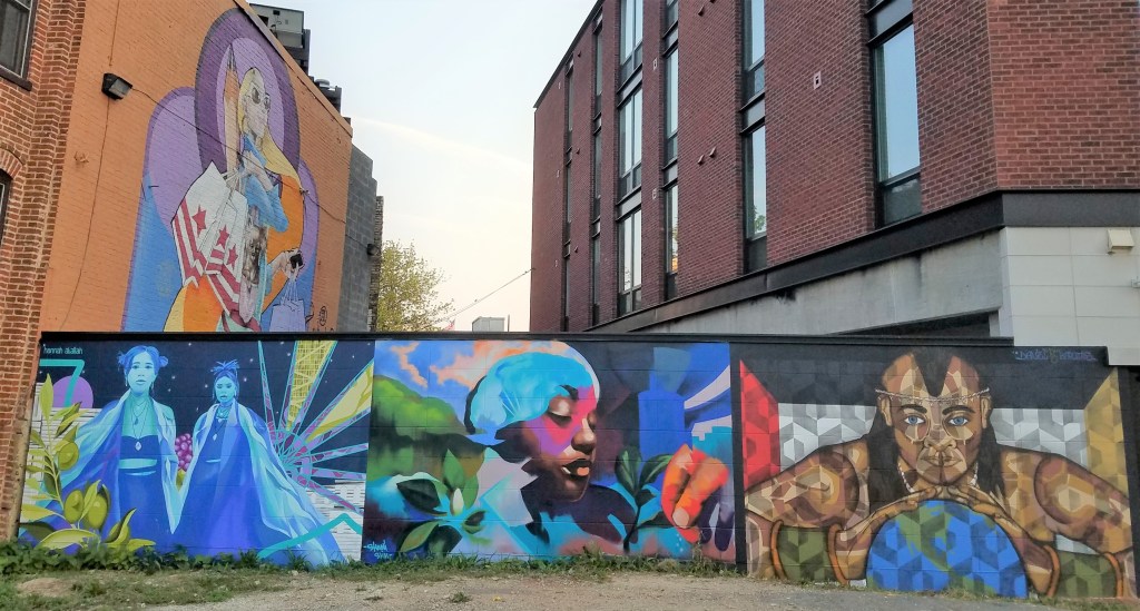 Shani Shih’s mural – the second of three at 8th Street and Virginia Avenue, SE – is titled “Evergreen”. She says she tries to speak to social/bodily experience – what it’s like to go through life. Her piece features an artist friend, Ann, a DC native who has been an inspiration. (Hannah Atallah’s mural “Rootedness and Displacement” which was first in the series was posted August 29.)