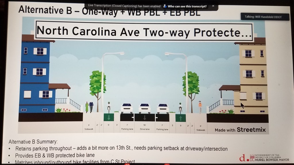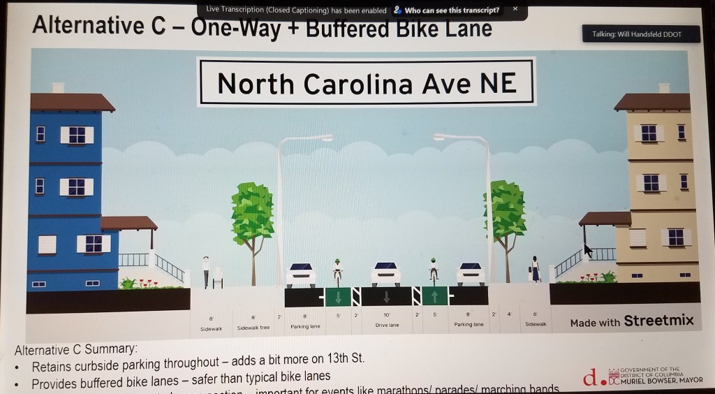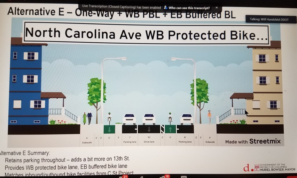 1300 block of North Carolina Avenue NE bike lane installation options. The District Department of Transportation (DDOT) is currently considering what type of bicycle facility to add to the 1300 block of North Carolina Avenue as part of its high priority bicycle network, and to ensure continuity between the C Street project (under construction) and the rest of the city’s bicycle network. This includes consideration of different options for directions of placement of car traffic and bicycle traffic lanes, including conversion to one-way vehicle traffic, as well as consideration of car parking and traffic calming measures. Will Handsfield, DDOT Bicycle Program Specialist, will follow up on questions raised at the July 2021 TPS meeting. DDOT is seeking the recommendation of the ANC as to which of the proposed designs (A through E) the community would prefer. In addition, DDOT is seeking input on proposed design adjustments to the intersection at 14th Street and North Carolina Avenue NE.