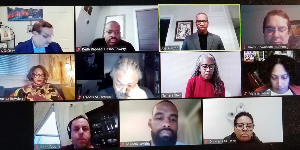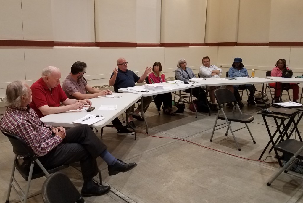 Donna Scheeder presided over a virtual meeting of the Eastern Market Community Advisory Committee on February 28, 2021. A meeting of the Eastern Market Community Advisory Committee meeting on September 25, 2019, in North Hall, Eastern Market. The before times. L-R Jerry Sroufe, Monty Edwards, Jonathan Page, Chuck Burger, Donna Scheeder, Susan Oulser, Mike Bowers, Angie Brunson, Anita Jefferson.