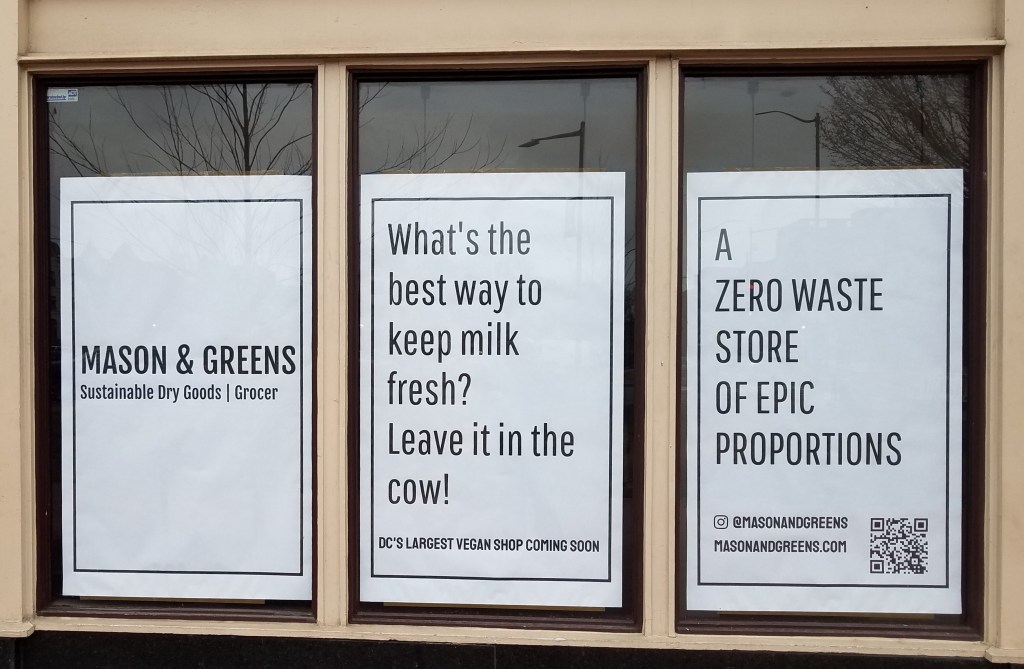 The signage on the former Baskin-Robbins at 8th and Pennsylvania Avenue, SE, announces the coming of Mason & Greens, Sustainable Dry Goods | Grocer. The company promises plastic free products that are ethically made and sustainably sourced and claims ownership of the title of DC’s largest vegan shop. Package free goods purchased on line can be delivered to your door with a $25 minimum and $5 delivery fee.