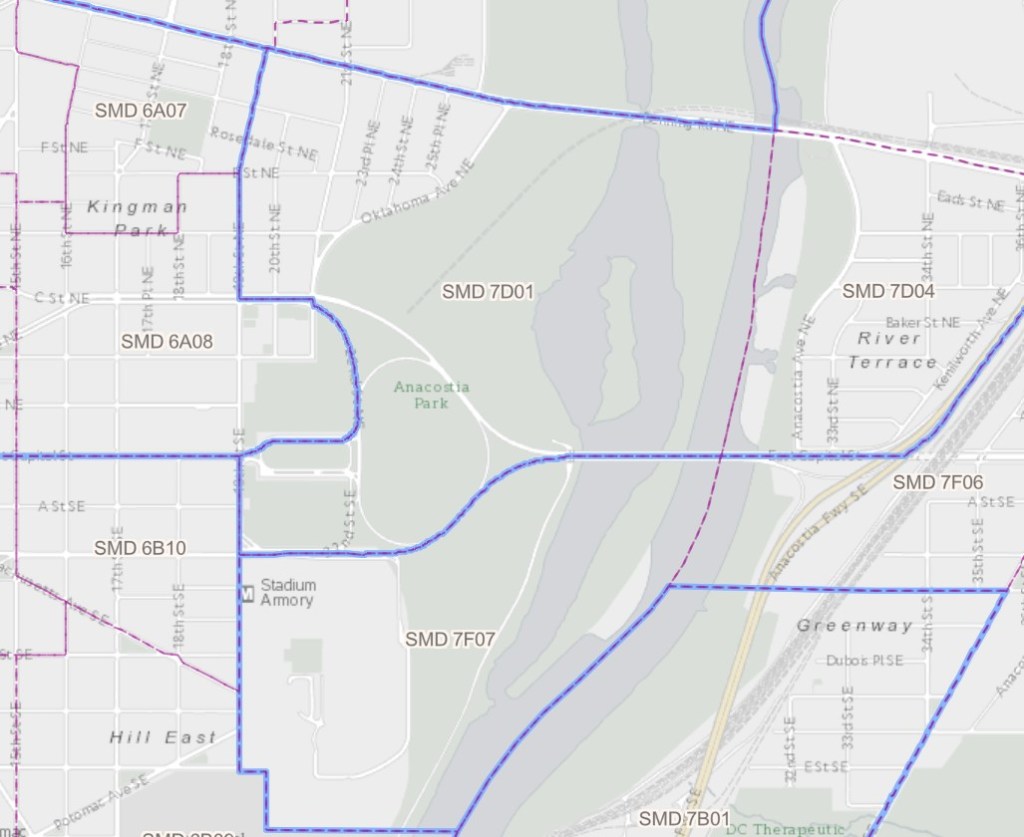 If adopted, the proposal would mean that two current Ward 7 ANCs (ANC7D and ANC7F) would give up jurisdiction over the RFK Campus and Reservation 13 respectively. It’s likely no accident that the co-chairs of the Ward 7 Redistricting Taskforce are commissioners from those two ANCs. (In Ward 6, CM Allen decided that no sitting commissioner or anyone who intended to run for the ANC should sit on the Ward 6 Redistricting Committee.)