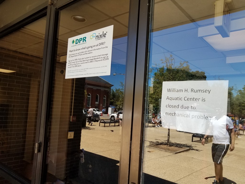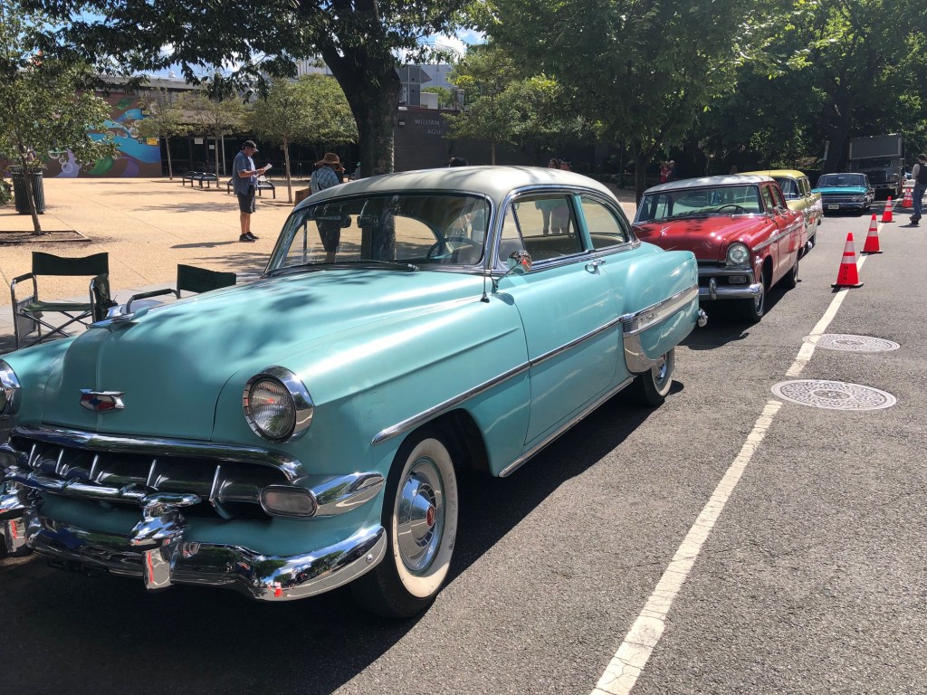 Last Friday Night Live Jazz on Eastern Market Metro Plaza featured Herb Scott. Here he is early in the performance playing Sam Cooke’s “Bring It on Home to Me.” After Friday’s night’s performance, Friday Night Live Jazz at Eastern Market Metro takes a break and returns on Friday, September 2. Milesanna White (at left) who works for the National League of Cities engages CM Charles Allen on violence prevention efforts and how programs are integrated into childhood years. White later said, “It was great hearing about efforts to provide a more integrated approach, especially in our neighborhood.” Allen held community office hours last Friday morning on the sidewalk in front of The Roost on Pennsylvania Avenue, SE.Swimmers who frequent Rumsey Pool next to Eastern Market have been frustrated by the closures (plural) of the pool over the last month or so. Rumsey, which was closed for a month to repair a ceiling in danger of collapse, reopened for a week and closed again because of an issue with the pool’s HVAC system. Repairs were scheduled for last week, but didn’t happen and the pool remained closed on Saturday. Planning and design work for a major renovation of Rumsey is scheduled to begin this fall.ICYMI – Last week Washingtonian reported that Newland restaurant which opened four months ago in the space formerly occupied by Montmartre, served its last dinner on July 30. Elliot Williams of the DCist reported rising food costs, labor shortages, and economic uncertainty as among the reasons. Chef Andrew Market’s Beuchert’s Saloon and Fight Club, around the corner on Pennsylvania Avenue remain open. You can read Markert’s letter announcing the closure on Instagram, here: https://bit.ly/3C9InYeThese vintage cars lined up outside of Rumsey Center last Friday were part of a scene for the Netflix film Rustin currently under production in the city. According to Wiki, “[t]he story revolves around gay civil rights activist Bayard Rustin, who organized the 1963 March on Washington. The film is produced by Barack Obama and Michelle Obama’s production company Higher Ground Productions.” Photo: Hilary Russell.