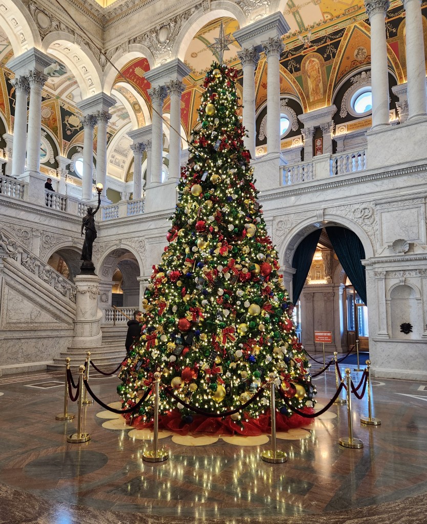 Here’s a shot from last Friday of the Christmas tree in the Great Hall of the Library of Congress. You’ll need a timed entry pass to get in to see it. Go here: https://www.loc.gov/visit/know-before-you-go/