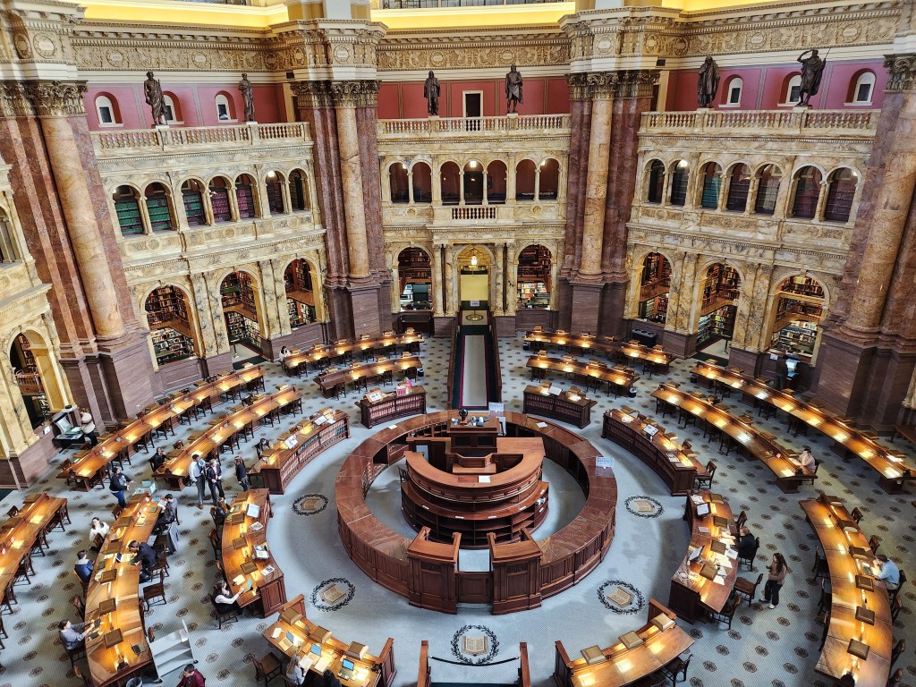 And speaking of which, here’s a shot of the Library’s Main Reading Room and the central desk which is the subject of a controversial plan which would entail removal of the center tower to permit construction of an oculus window giving visitors on the floor below a view of the interior dome of the Library. One of the LOC volunteers who are present to answer questions said that the oculus project was dead. (Later, a second source told CHC it had been scrubbed a few weeks ago.) In November, The Society of Architectural Historians released a September 8, 2022, letter from the SAH Heritage Conservation Committee to Librarian of Congress Dr. Carla D. Hayden in opposition to the proposed alterations to the Main Reading Room. See here: https://bit.ly/3HtWrhY