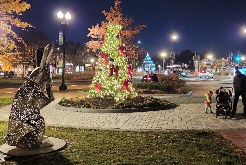 Last week, the Capitol Hill Christmas tree (in the background) nicknamed “Big George” after George Didden, was lit to great fanfare and large crowds. Meanwhile, a companion tree – ” Little George” – maintains a stately presence near the playground on the NE quadrant of the Metro Plaza.