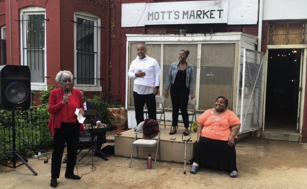 On Saturday afternoon, April 29, the very active local effort to reopen Mott’s Market on 12th Street, SE as “a revitalized corner market and community hub” featured members and friends of the Holy Comforter-Saint Cyprian (HCSC) Music Ministry. This “Motts Legacy Event” offered copious free treats and testimonies about Mott’s, including fond memories of buying penny candy there decades ago. The event also collected donations for HCSC’s Food Pantry on East Capitol Street and promoted the purchase of inscribed bricks that will help fund the renovation. One purchaser said she will inscribe the name of her father, who grew up on Walter Street in the 1920s. Photo and caption: Hilary Russell