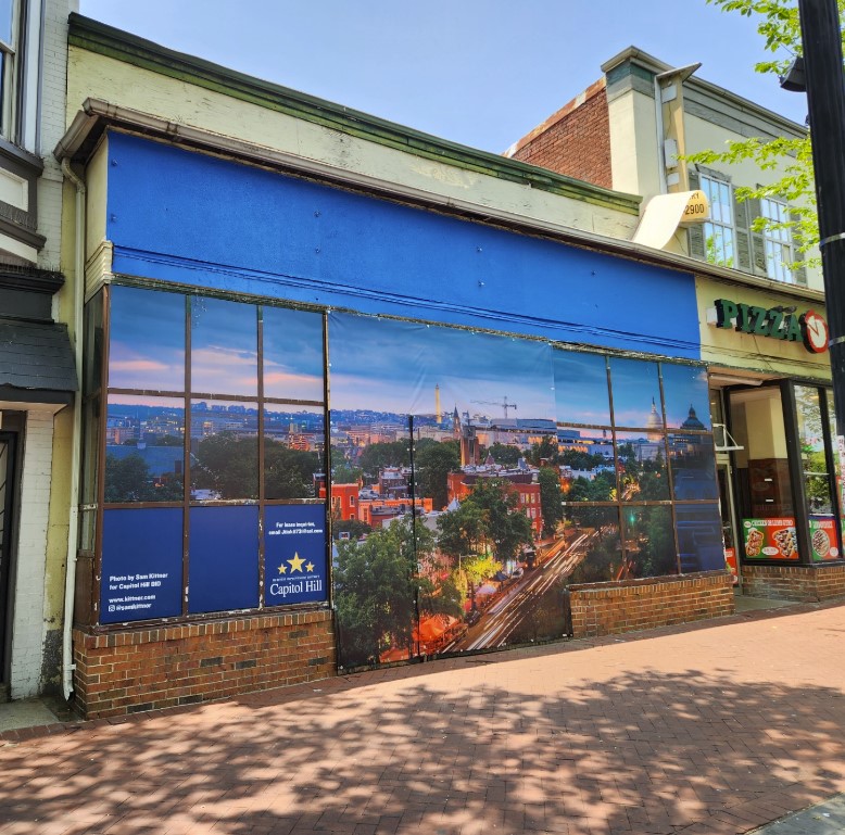It looks like the owners of the former Tandoor Grill on Barracks Row at 419 8th Street have spruced up the façade of the For Lease building with an enlarged city scape photo. (An alert reader points out the signage indicates the photo was provided by the Capitol Hill BID – an earlier version credited Barracks Row MainStreet.) The conditions outside the front of the building had become pretty nasty what with the bird droppings and such, adding another layer of distress to the forlorn building.