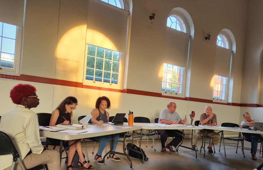 Last Wednesday’s meeting of the Eastern Market Community Advisory Committee. Left to right: Robyn Hinson-Jones, Capitol Hill Village; Jackie Krieger, Mayor Bowser’s Representative and Vice Chair of EMCAC; Nikki Dean, Nonfood Vendors Representative; Chuck Burger, CHAMPS Representative and Chair of EMCAC; Gerry Sroufe, ANC6B; Brian Pate, Council Member Allen’s Representative.