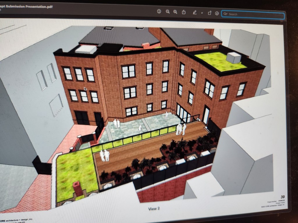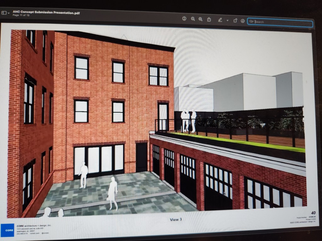 The applicants also shared renderings of the latest plan for the still-pending application to close the alley behind the Capitol Lounge and additions to the rear of the three buildings. The drawings show that the alley space could be event space – which appears to be the anticipated use of the roof top of the several connected garages (also owned by the Conservative Partnership) bordering the proposed closed alley. Or the space could be used for outdoor seating for the restaurant that the Partnership intends to establish in the space formerly occupied by the Capitol Lounge. The Committee voted 15 – 0 to recommend the full ANC support the changes to the façade and to note that they haves concerns about noise and privacy issues regarding the event/outdoor seating space at the rear of the properties.