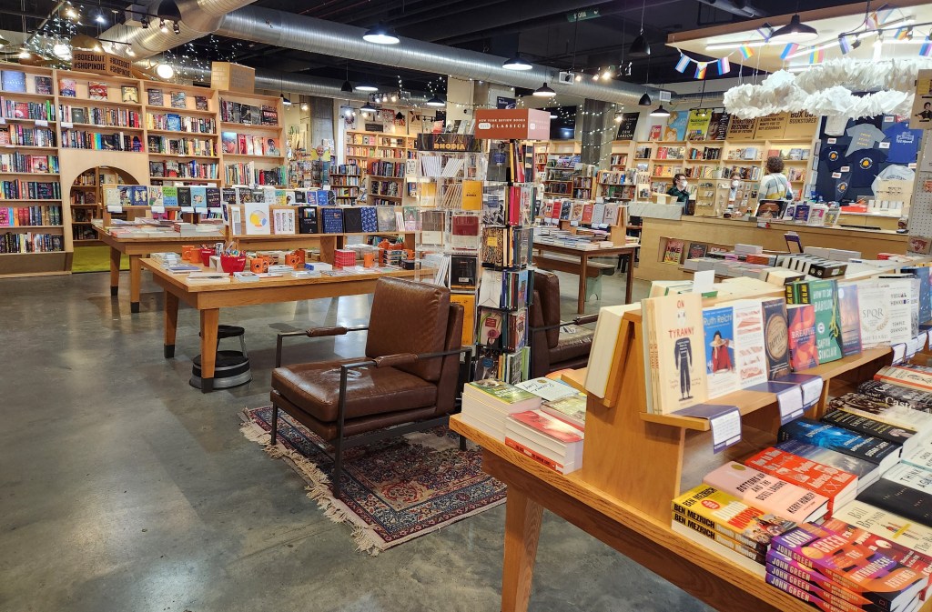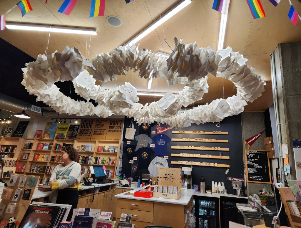 Inside Solid State Books at 600 H Street, NE. The swooping paper sculpture above the central checkout counter and work station was created by the design firm Spaeth Hill. Bookstore owners Scott Abel and Jake Cumsky-Whitlock commissioned the piece when the store opened on H Street in 2018.