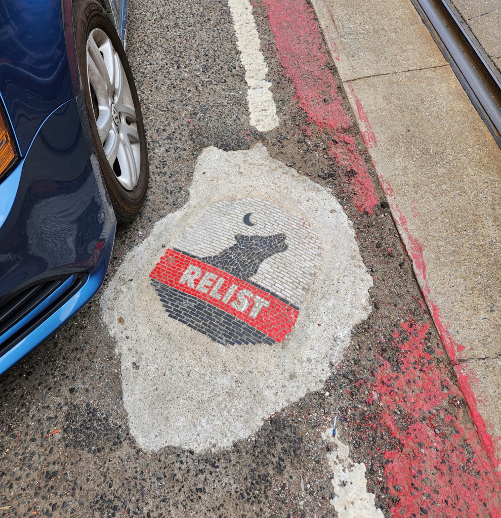 The rogue artist street art outside of Solid State Books has held up pretty well since its installation in November of 2022. ICYMI WAPO had an article on Chicago artist Jim Bachor who contracts with individuals and organization to fill potholes with concrete topped with a mosaic. This one, on H Street, NE, in front of Solid State Books, was commissioned by the #Relist/Wolves Campaign to re-list the Rocky Mountain Northern Wolf as an endangered species. For more, go here: http://bit.ly/3ANDGBO