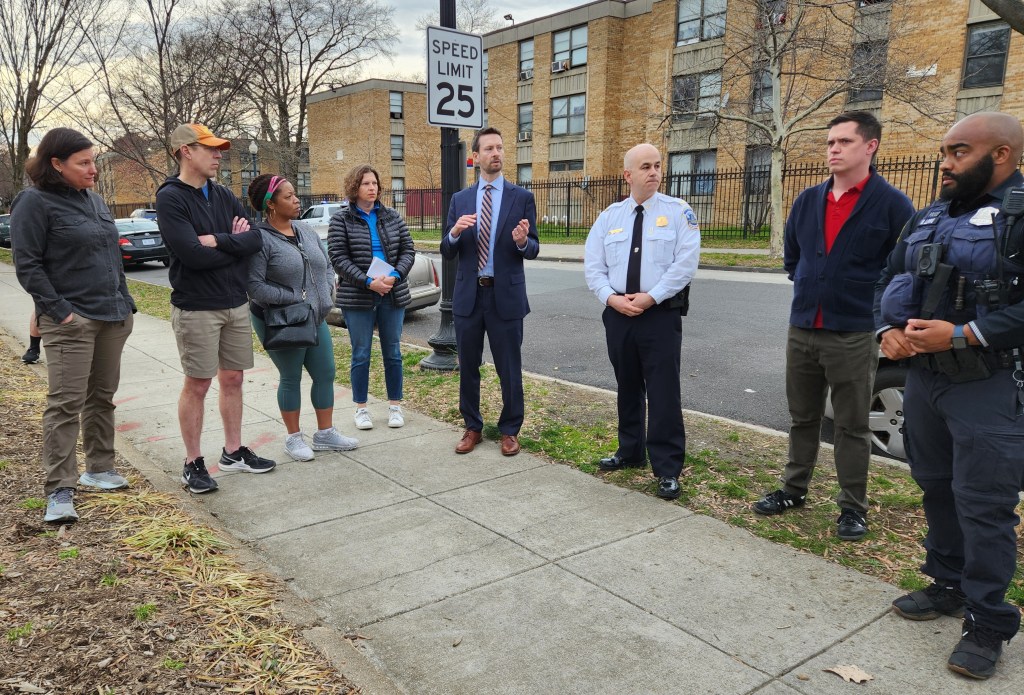 Another Safety Walk: Last Monday, ANC Chair Edward Ryder organized a community safety walk which started at 13th and I Streets, SE, and proceeded along L Street adjacent to the highway and ended at the McDonald’s on Pennsyvania Avenue. CM Charles Allen, MPD, and a representative of the Mayor’s Office of Community Relations participated. These walks do more than providing an opportunity for residents to engage with the Councilmember and MPD. They provide an opportunity to bring officials’ attention to a broad array of quality of life issues – some of which can be scheduled for immediate remedy. The walk ended with an extended sidewalk discussion at the McDonalds. On the way back to the starting point, CHC was surprised at the extent of multi-unit residential development on K Street in this out-of-the-way neighborhood. Above, to CM Allen’s left is MPD 1st District Commander Colin Hall, then ANC6B Chair Ryder. To Allen’s right is Kelly Waud, Ryder’s predecessor as 6B Commissioner, who currently is an alternate on ANC6B’s Public Safety Committee.