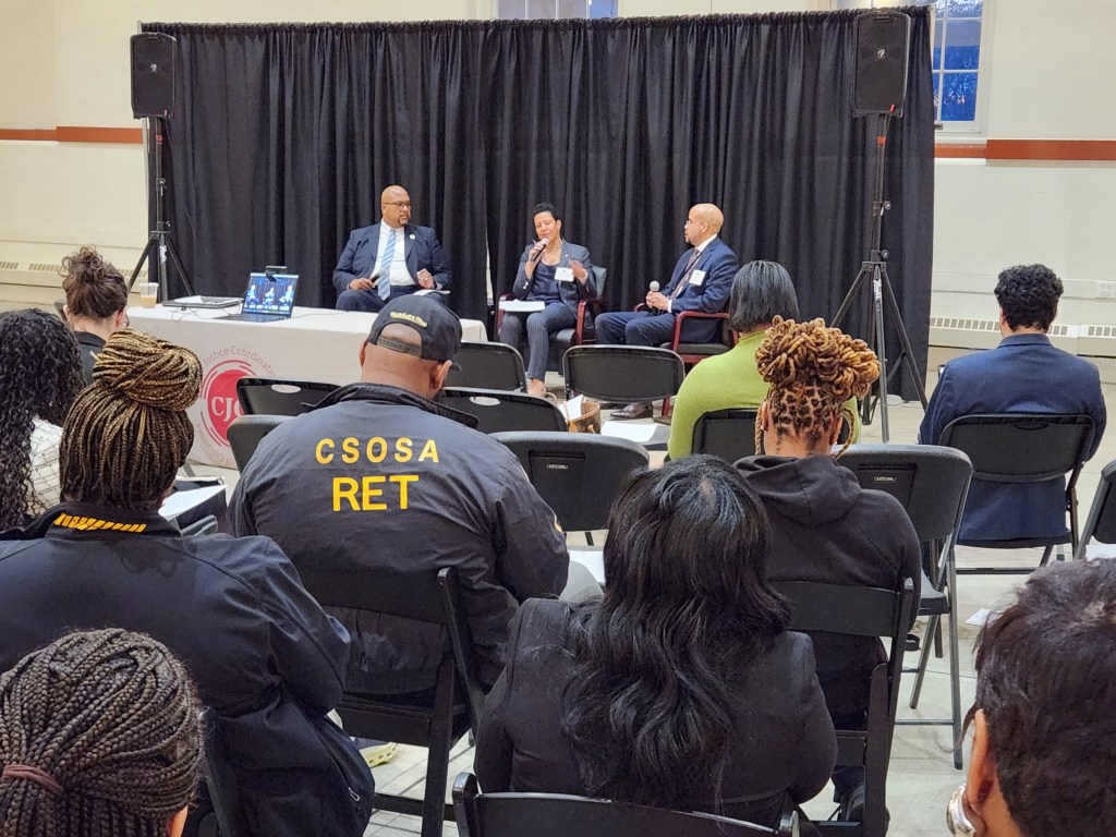 Kristy Love, Executive Director of CJCC moderated the discussion. On the right is Victor Davis, Assistant Director, Defendant Engagement and System Support, Pretrial Services Agency and on the left, Marcus Hodges, Associate Director, Office of Community Supervision & Intervention Services, Court Services and Offender Supervision Agency (CSOSA). In the midst of a debate over criminal justice in the city, the public engagement serves to explain the agencies’ roles and defend their record – which they say is very good.