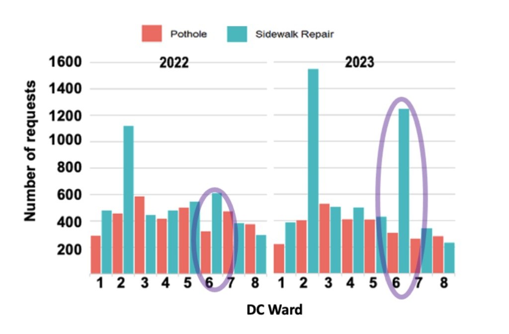 A note from Capitol Hill Village – How to get those sidewalk hazards fixed: This chart shows how the number of Ward 6 complaints to 311 about sidewalk hazards has more than DOUBLED in the past year. As always, if you don’t have time to file your own 311 report of a sidewalk hazard, you can send a picture of the problem with the address of the problem to chvpedestriansafety@gmail.com and someone at CHV will file the 311 report for you. While our DC government still expects to address each tripping hazard in 270 business days – more than one year – the first step is filing the 311 request.