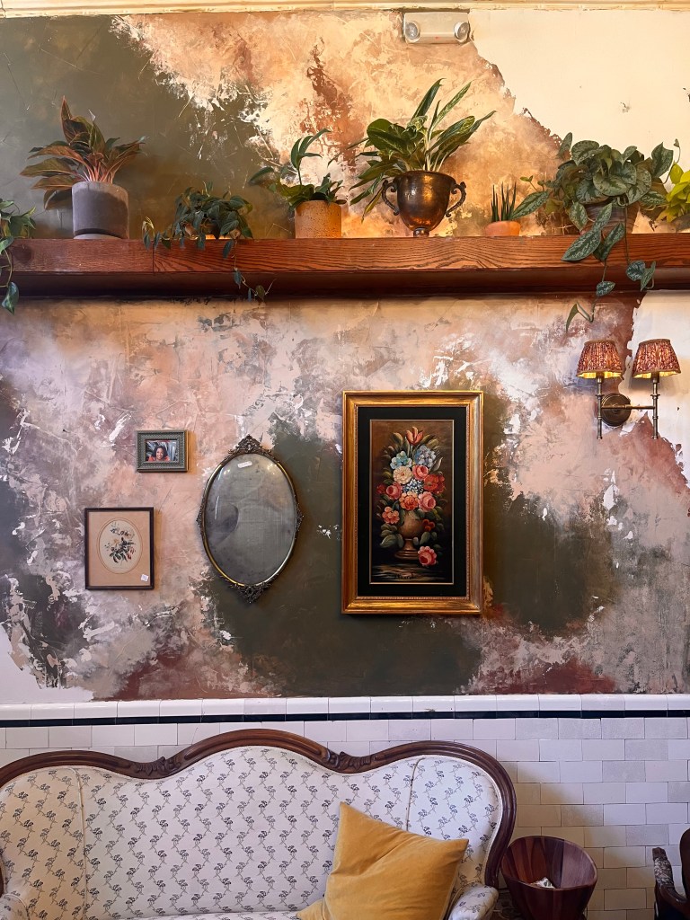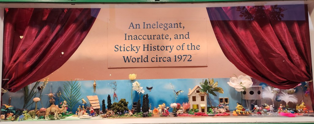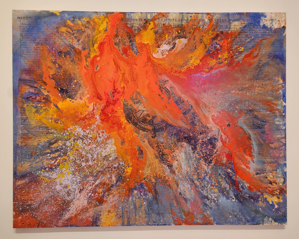 Here’s a photo of a piece in the National Museum of American Art: American Voices and Visions, Modern and Contemporary Art. It’s by Firelei Baez, Untitled, 2022. From the label: “Beneath the swirling streams of paint lies an image of the Atlas Historique, a map created in 1718 to document the recently conquered European colonies. Charting the farthest reaches of human knowledge at that time, the Atlas joined the earth, the solar system, and the constellations into one view.”
