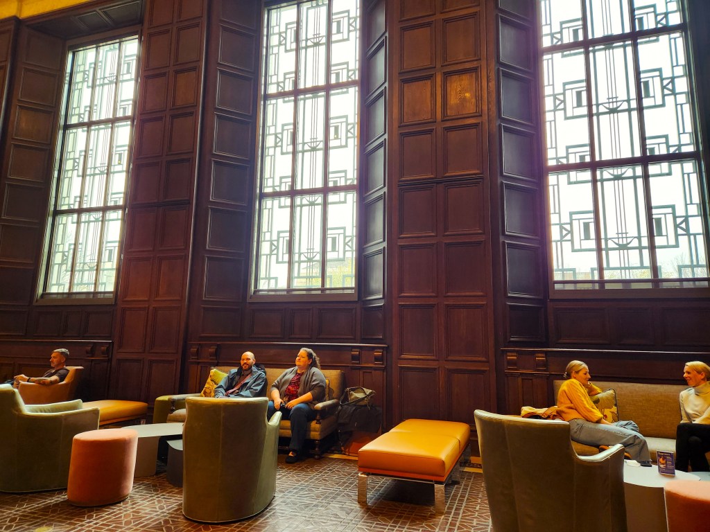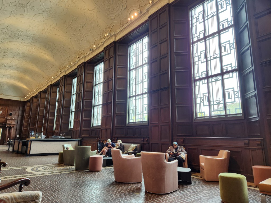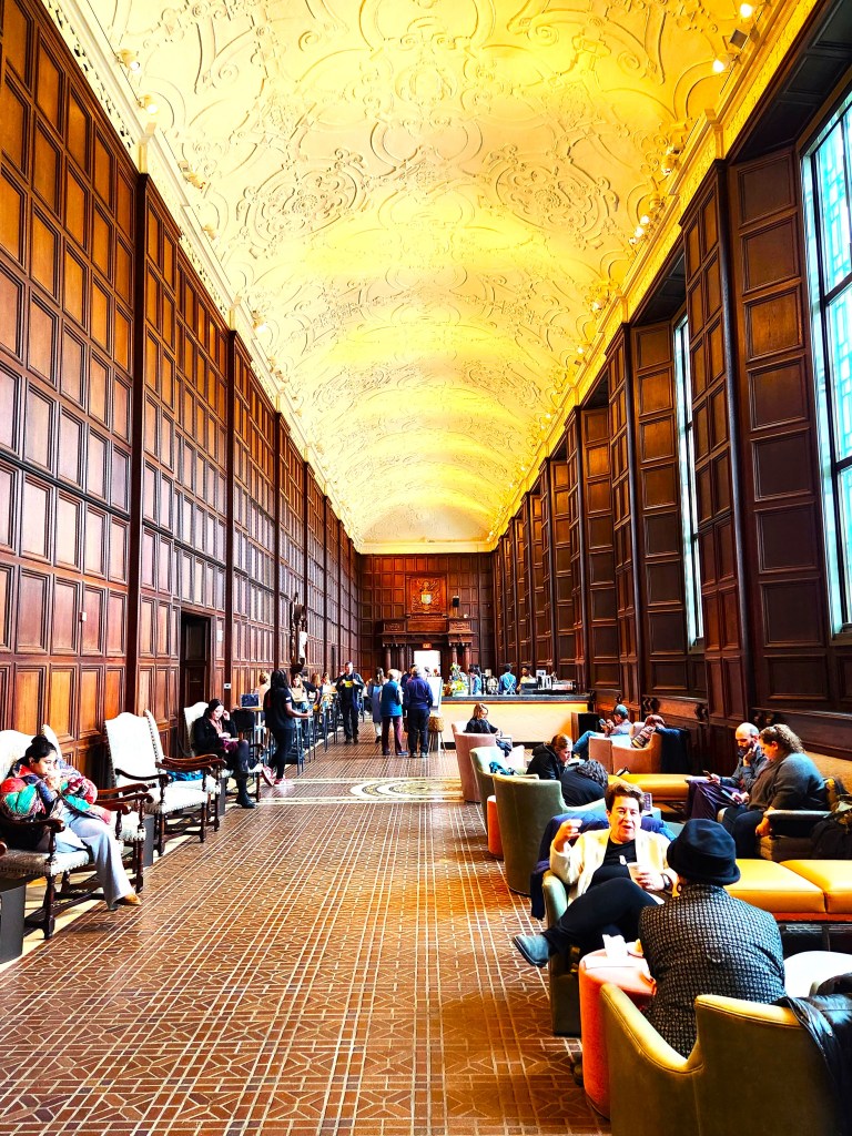 Photo, walking from east to west through the Great Hall. This is the lounge area catering to socializing over drinks or a light bite before a performance in Folger Theatre.