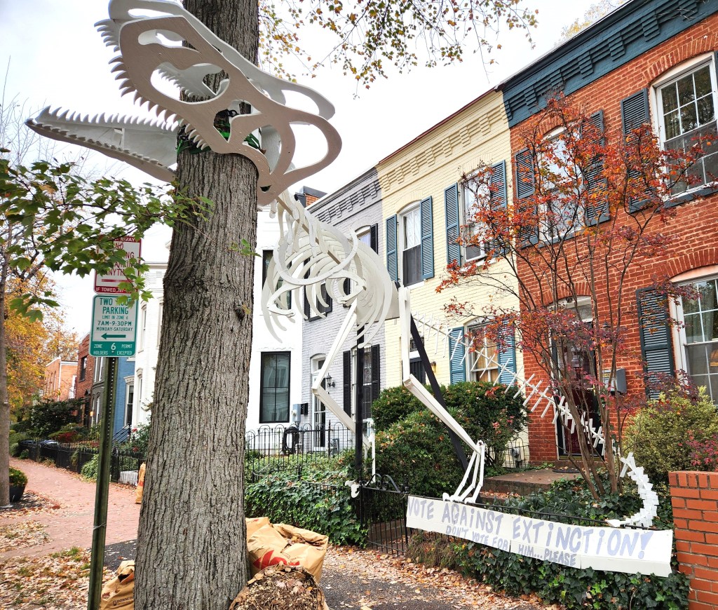 On 10th Street, SE, between E and G Streets. A T. Rex skeleton model over a sign: “Vote Against Extinction. Don’t Vote For Him…Please!”