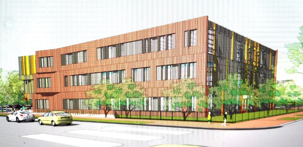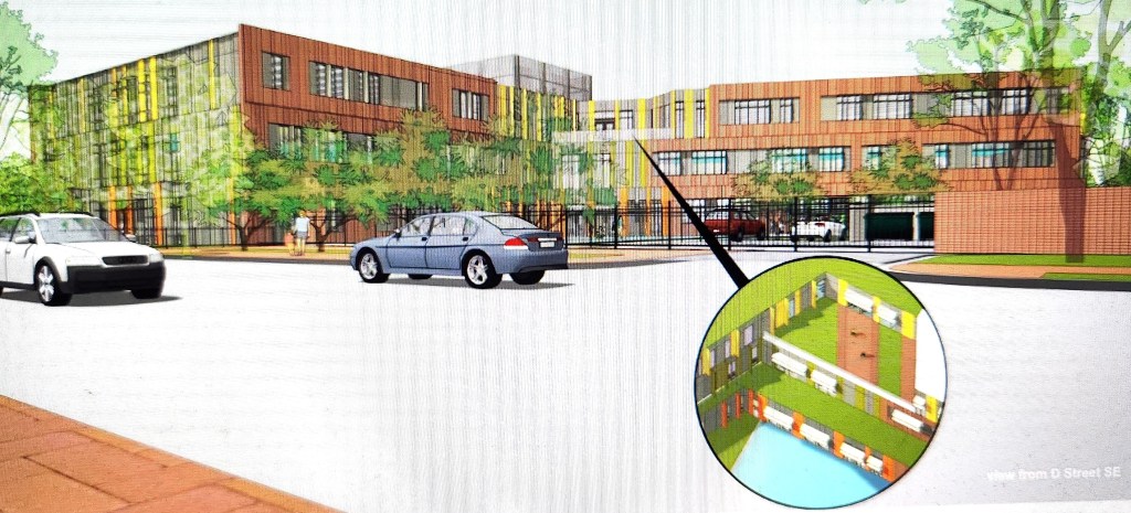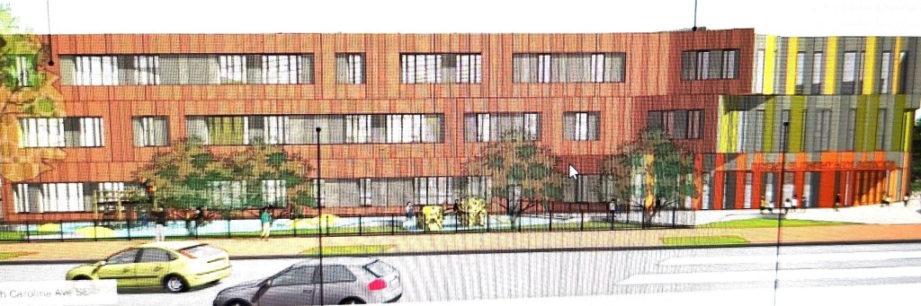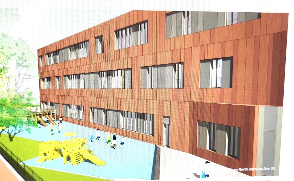 Architect’s rendering of the new Brent School seen from North Carolina Avenue. The entrance is at the right.
